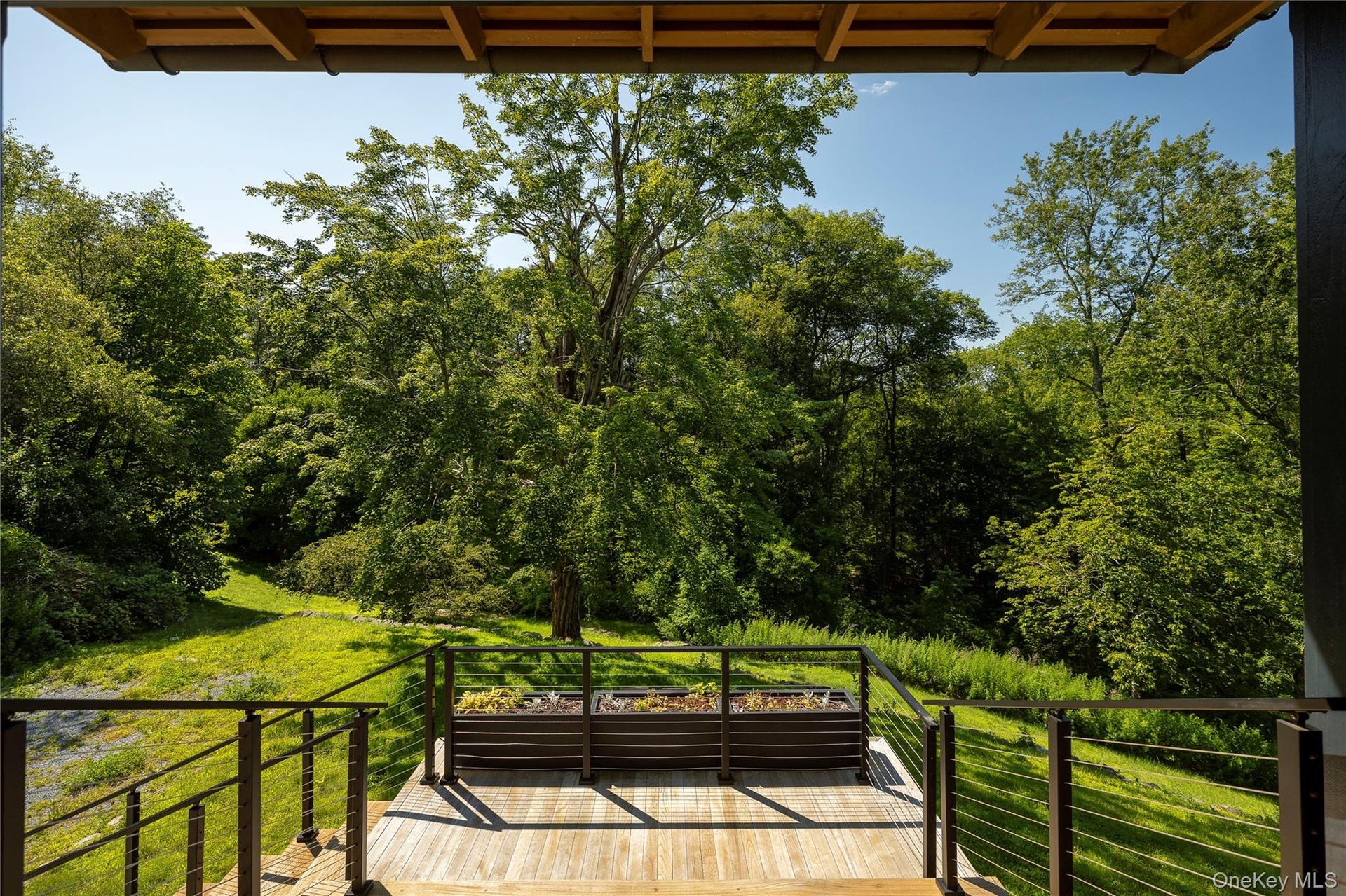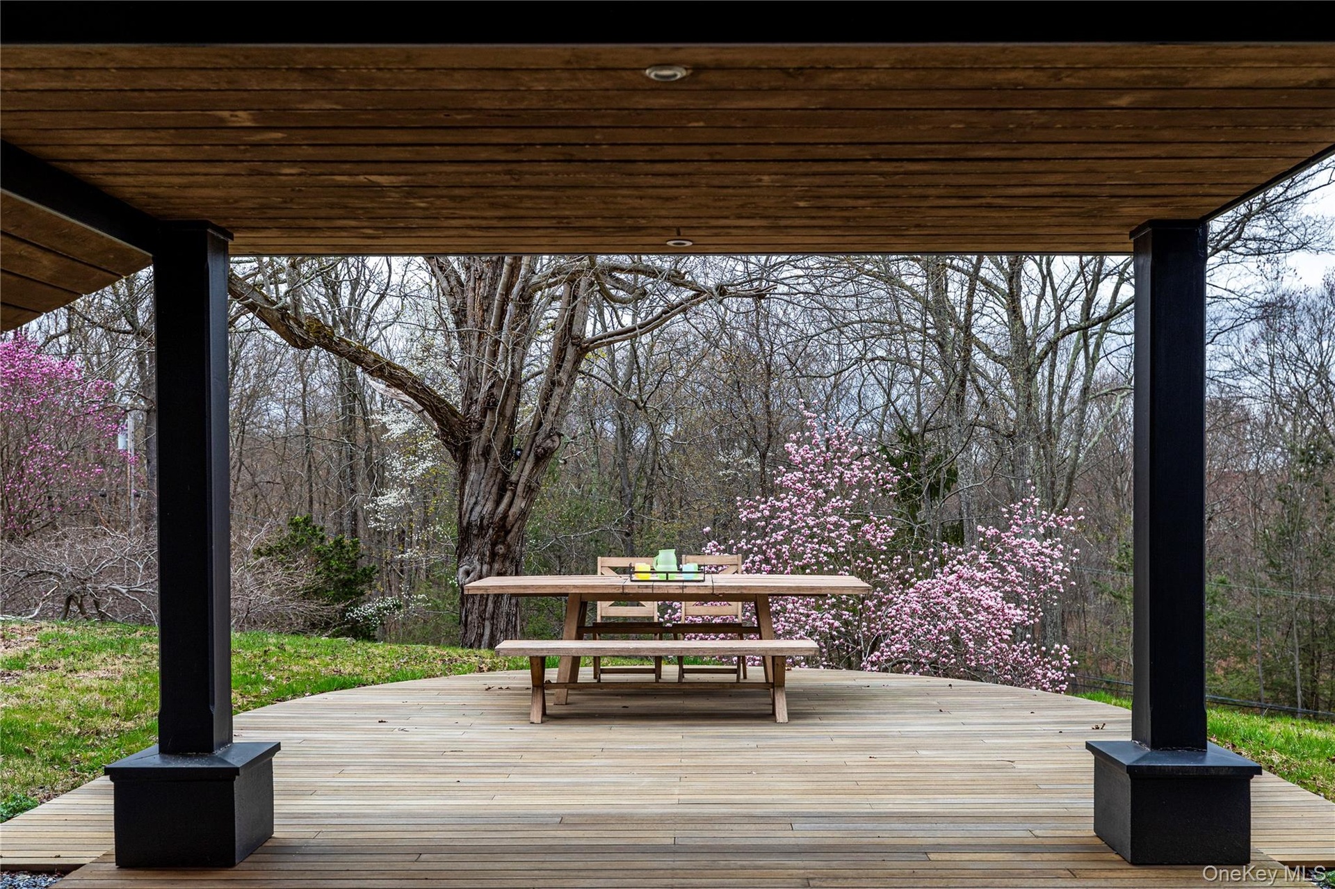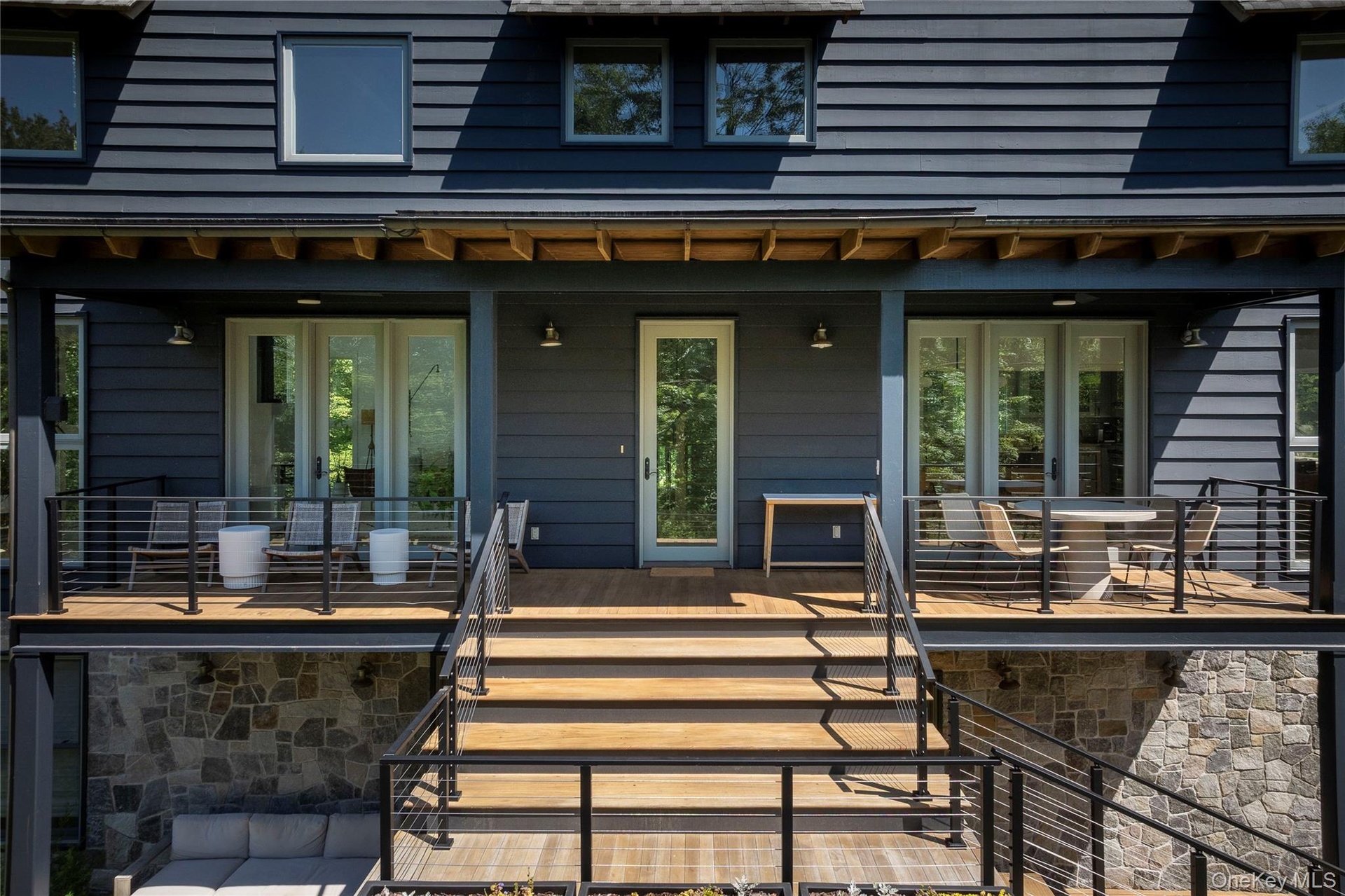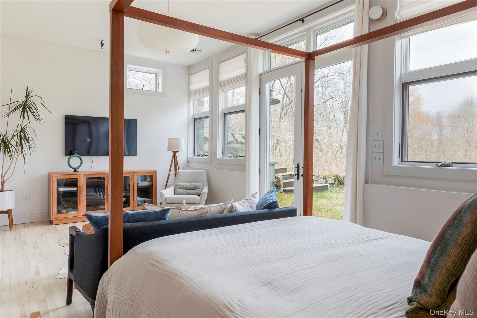 Two additional bedrooms, a full bath, and a flexible space (think WFH space or cozy guest den) are located on a separate floor with private access from the patio—making it ideal for guests. From here, head outside to the spacious teak deck, yard, garden, and wooded backyard.