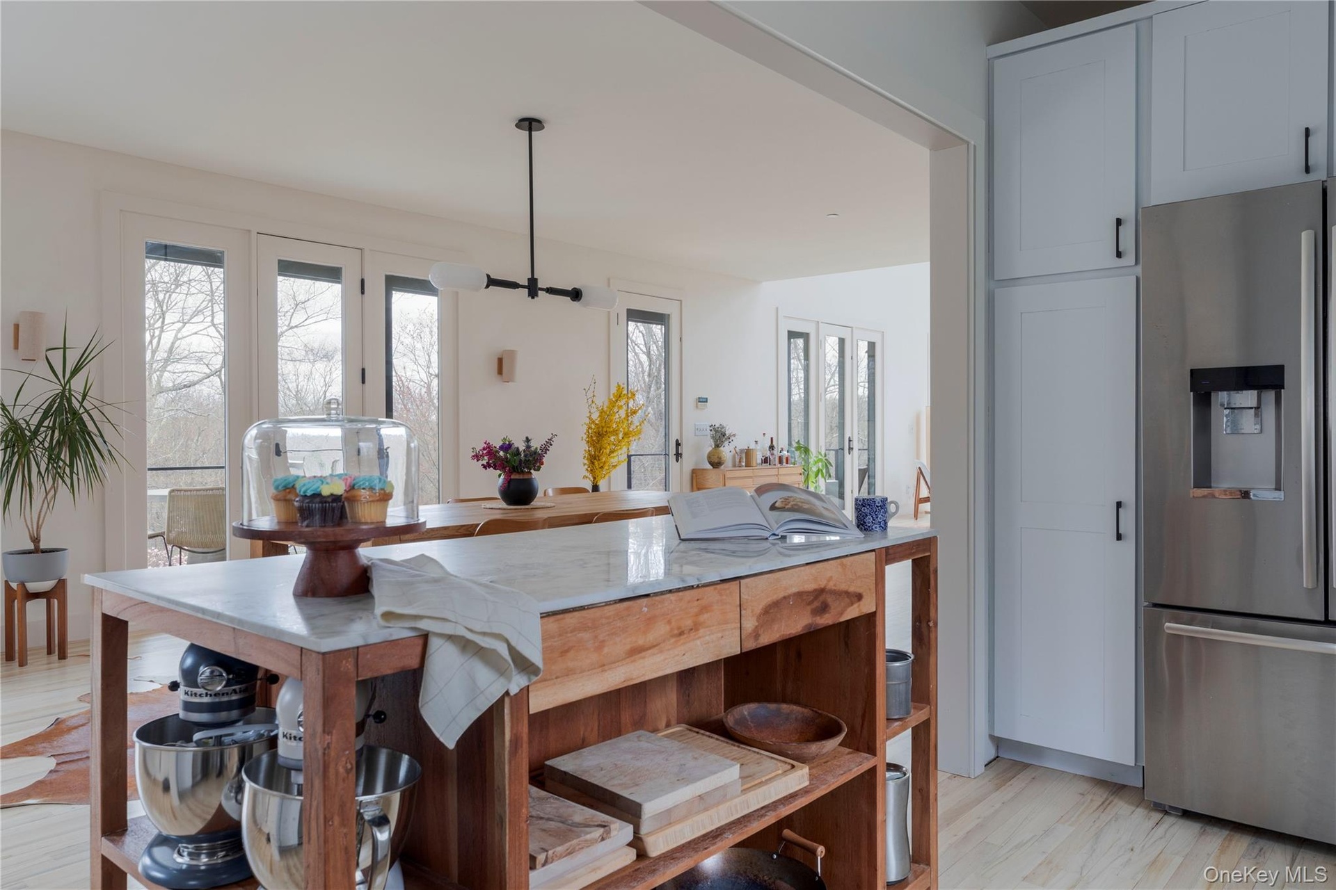 - Kitchen featuring stainless steel fridge, light wood-style flooring, hanging light fixtures, and a center island