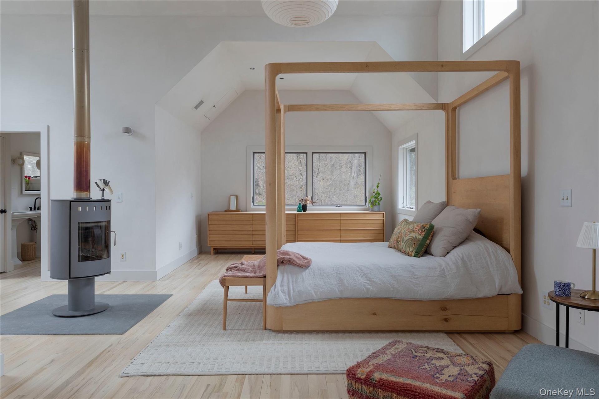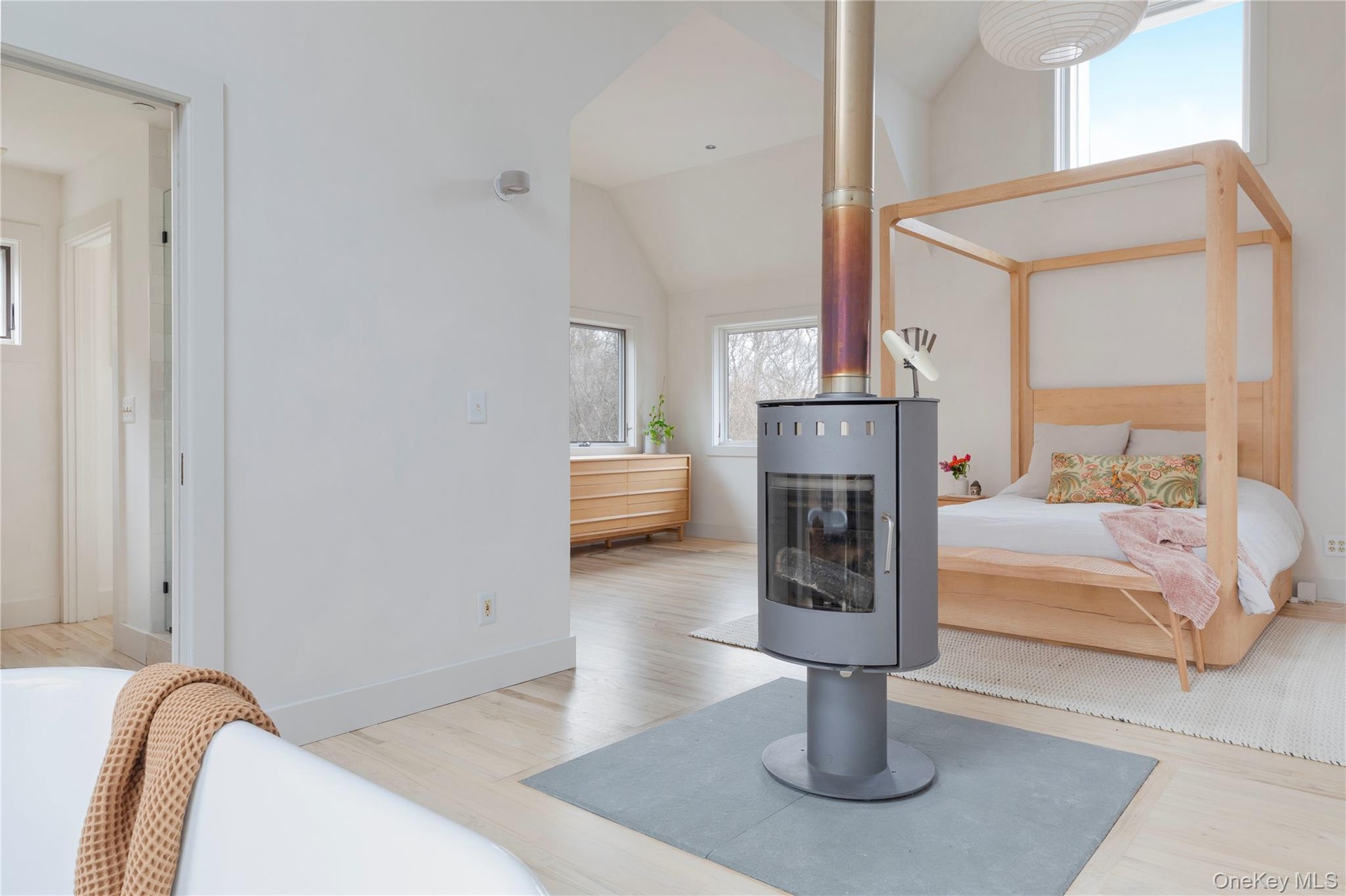 Upstairs is a dreamy, full-floor primary suite that feels like a private sanctuary. Vaulted ceilings, a seating area, a soaking tub looking right in the primary and an ensuite bathroom, plus a wood-burning stove that pivots between bed and bath—yes, really.
