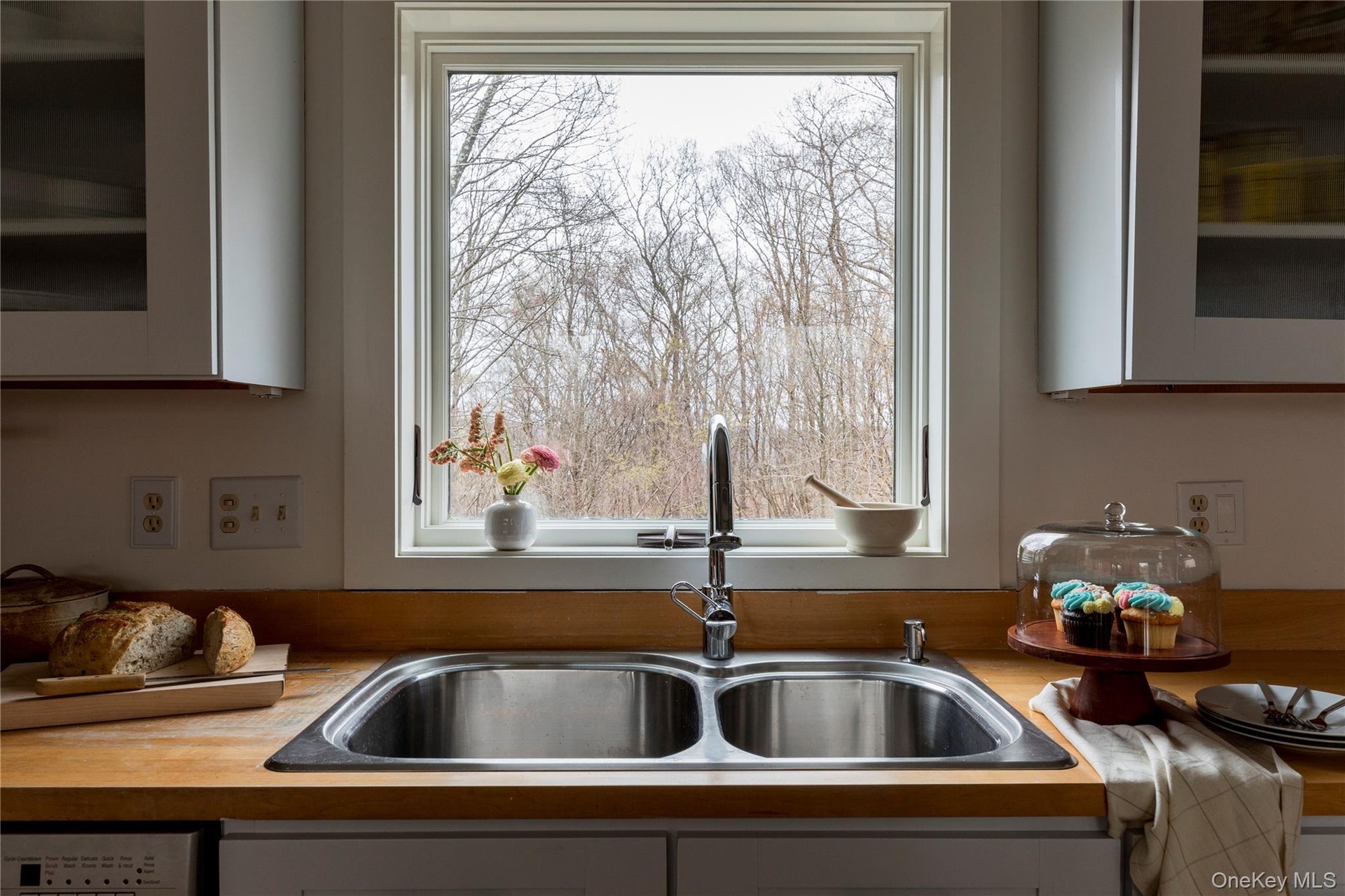 - Kitchen featuring white cabinetry and glass insert cabinets