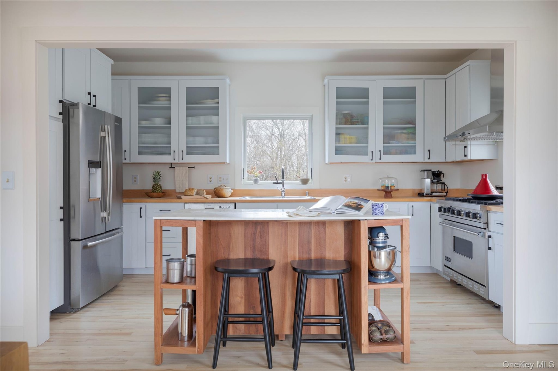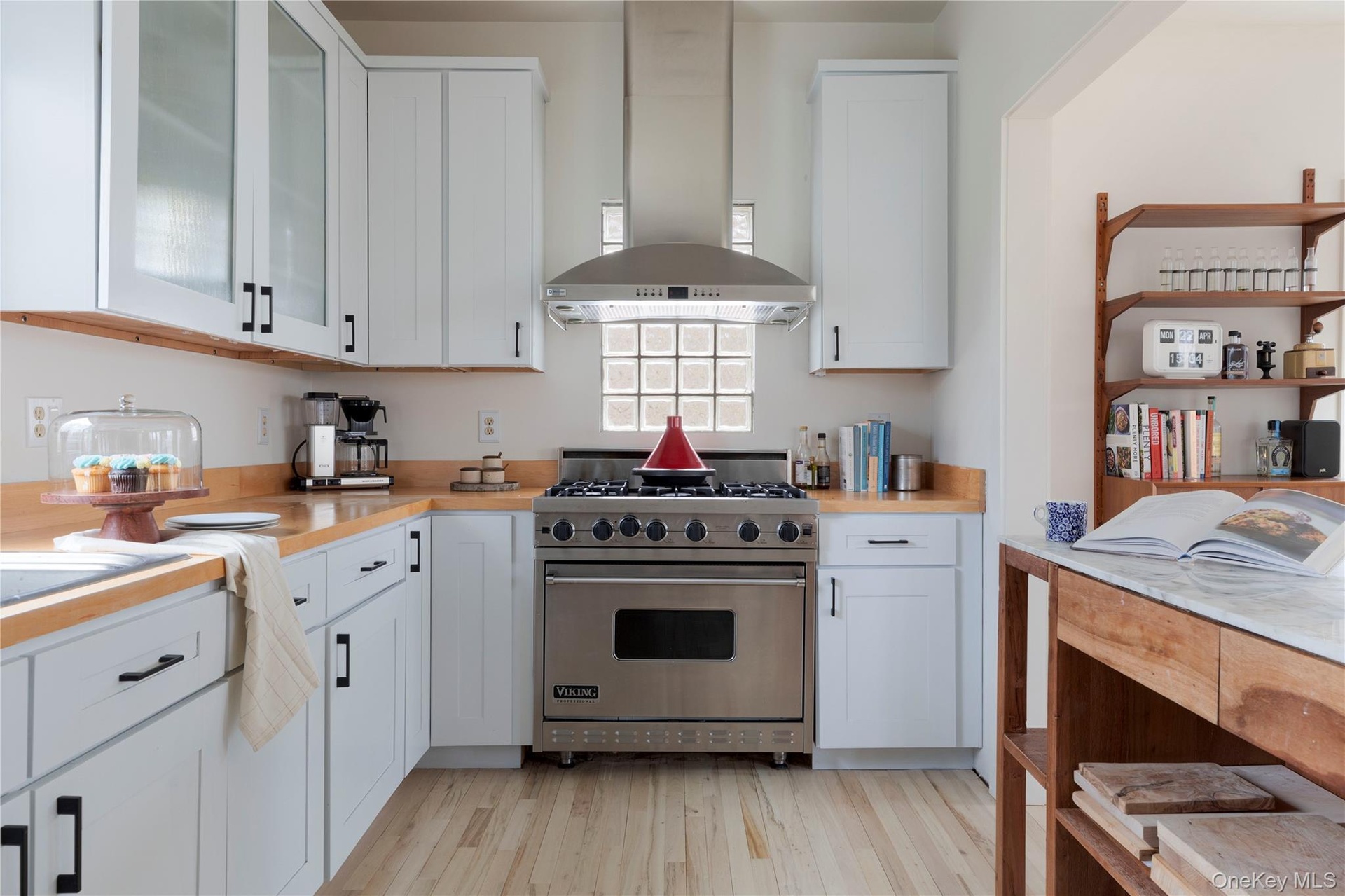 - Kitchen with butcher block counters, glass insert cabinets, wall chimney range hood, and appliances with stainless steel finishes