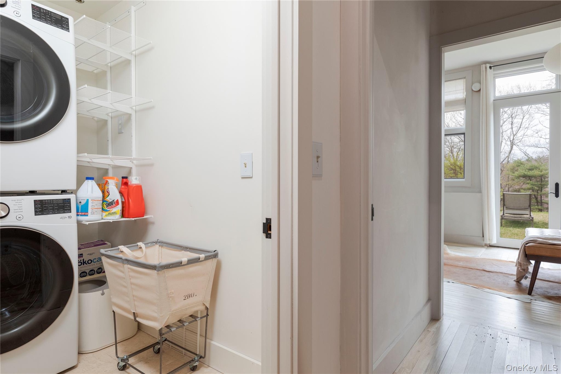 - Dining space featuring light wood-type flooring and estacked washer and dryer