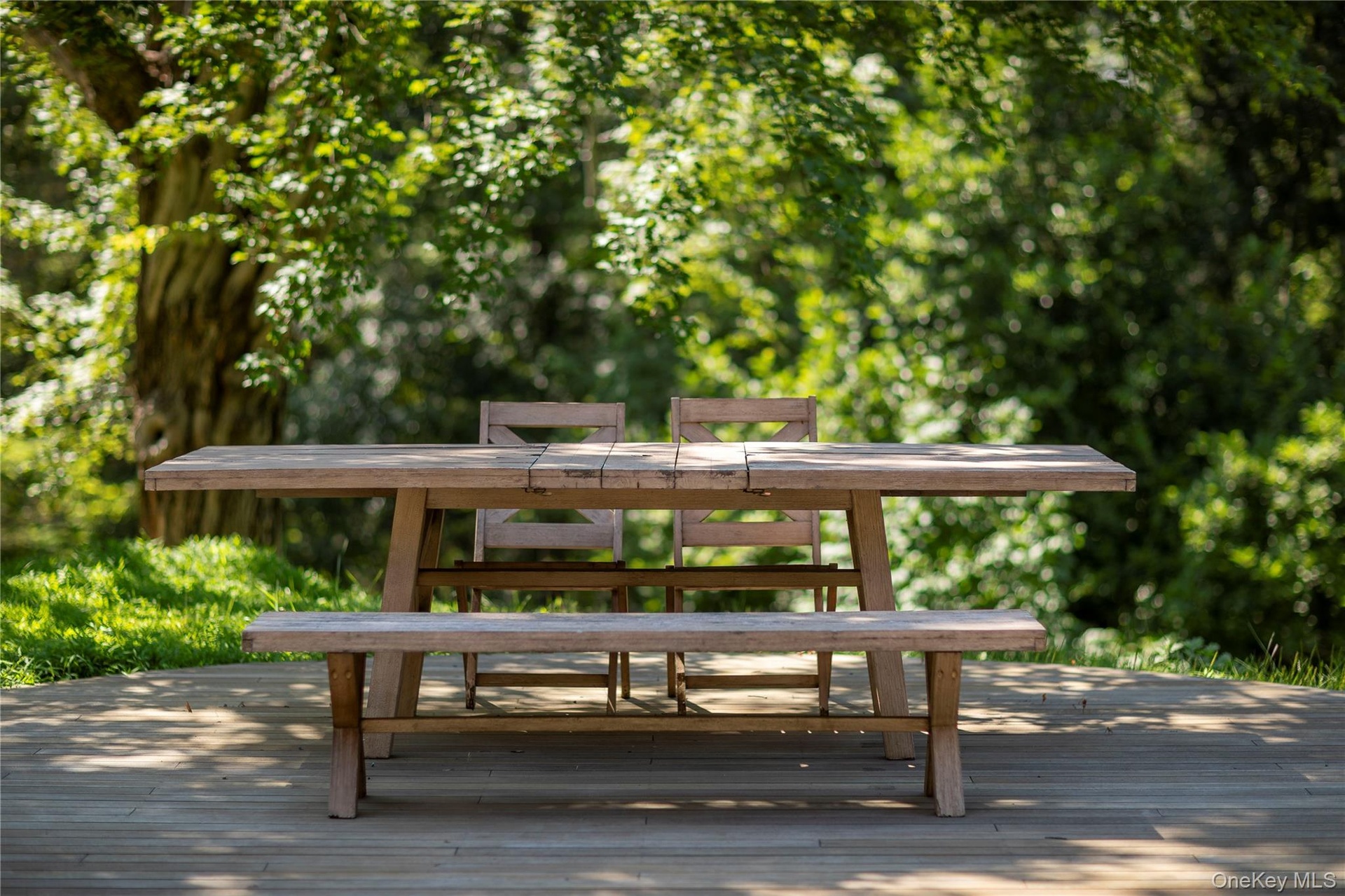 - Wooden terrace featuring outdoor dining area