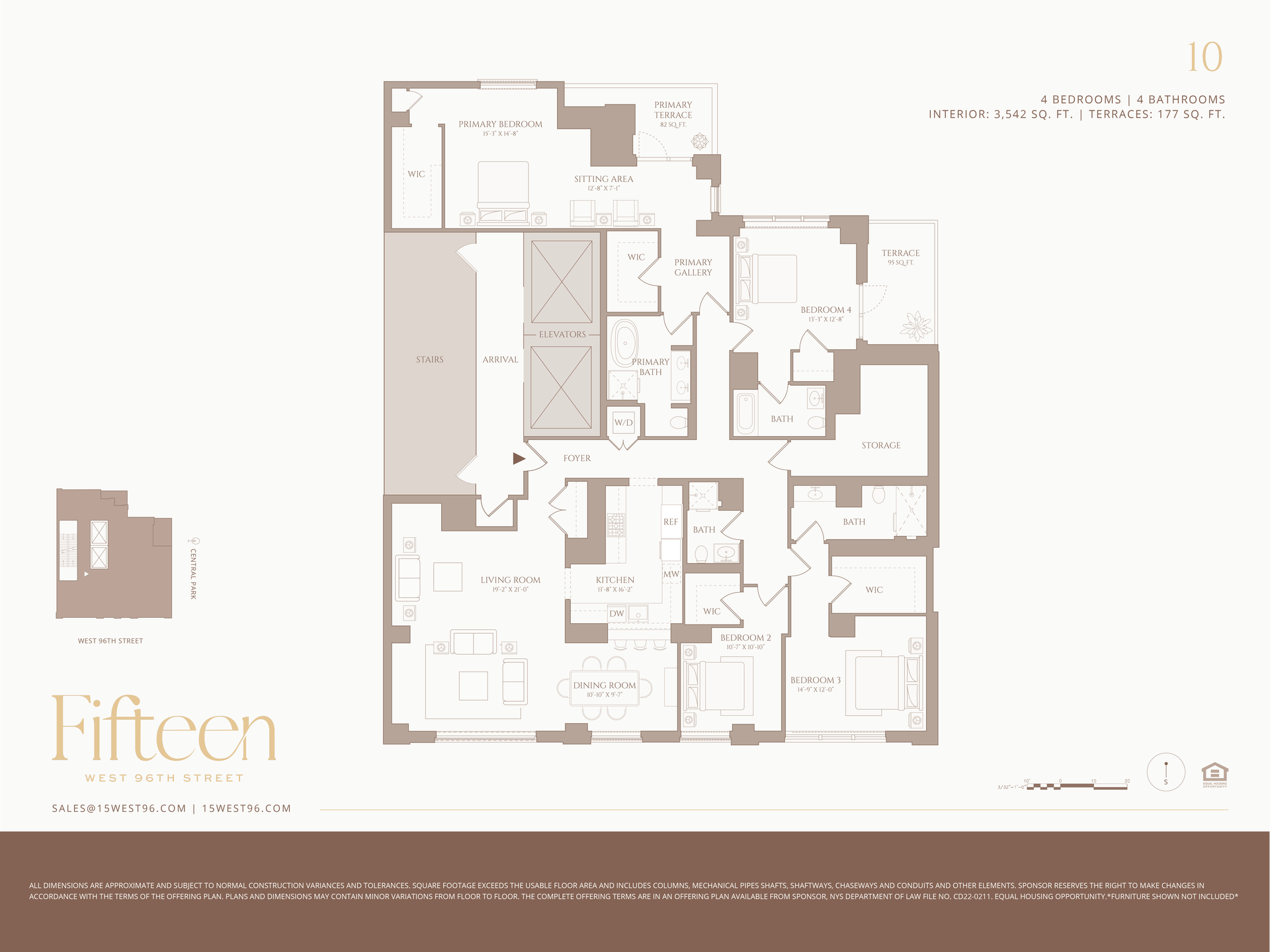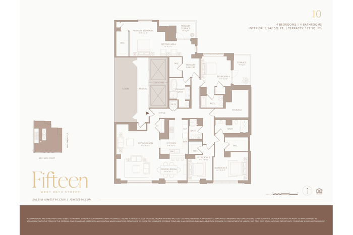 Presenting Residence 10—the only four-bedroom home at 15 West 96th Street. Spanning an entire floor, this expansive 3,542 SF residence boasts two private terraces and triple exposures, filling the interiors with natural light. Upon arrival, oversized casement windows welcome you, accentuating the 5 1/4-inch white oak herringbone flooring that extends throughout the kitchen, hallways, living, and dining rooms.