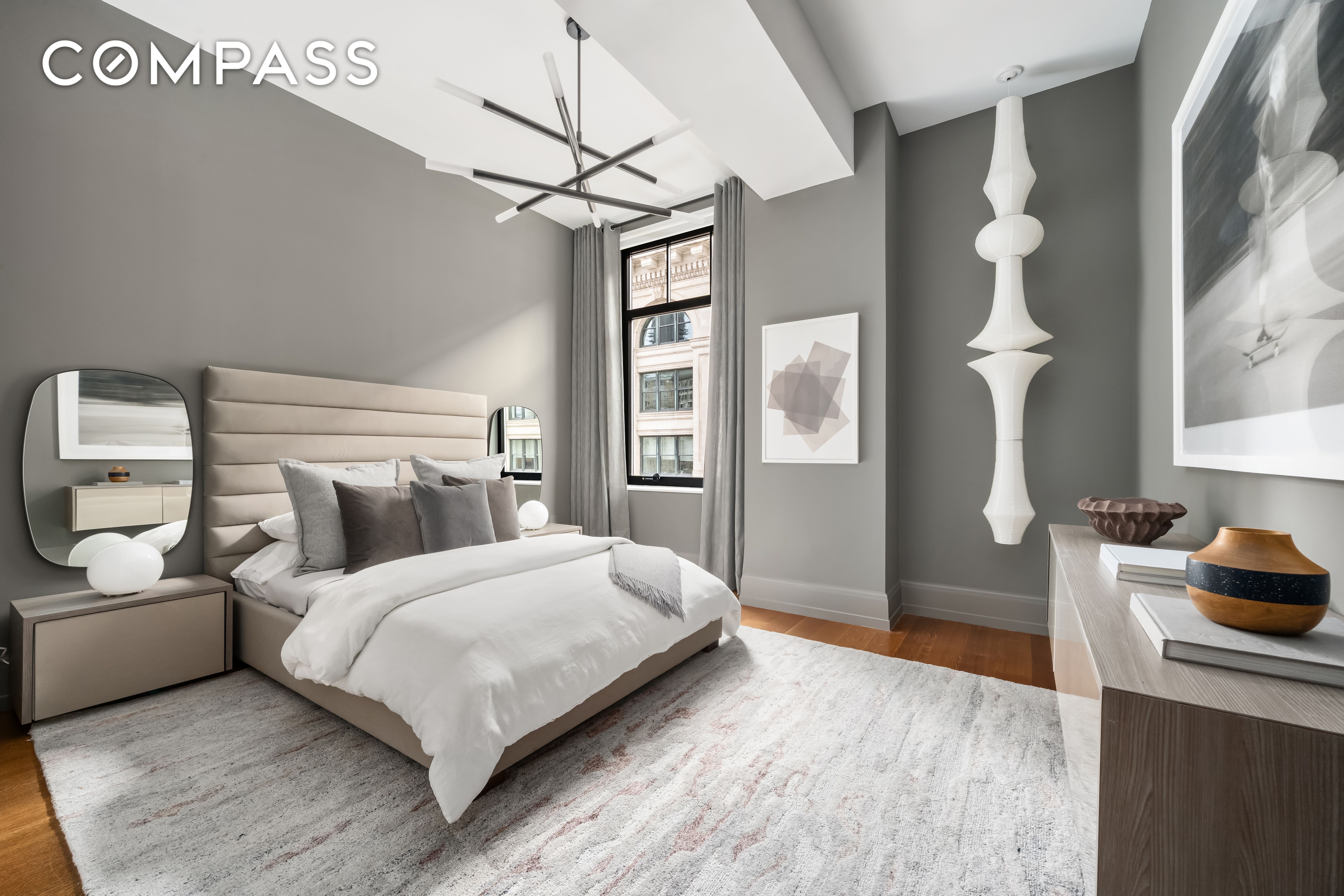 At the heart of the home lies the expansive great room and open kitchen, ideal for entertaining or quiet nights in. Framed by panoramic views of Madison Square Park, the space is flooded with natural light and designed to inspire. The chef’s kitchen is outfitted with sleek stainless steel Miele appliances, combining form and function with impeccable style.