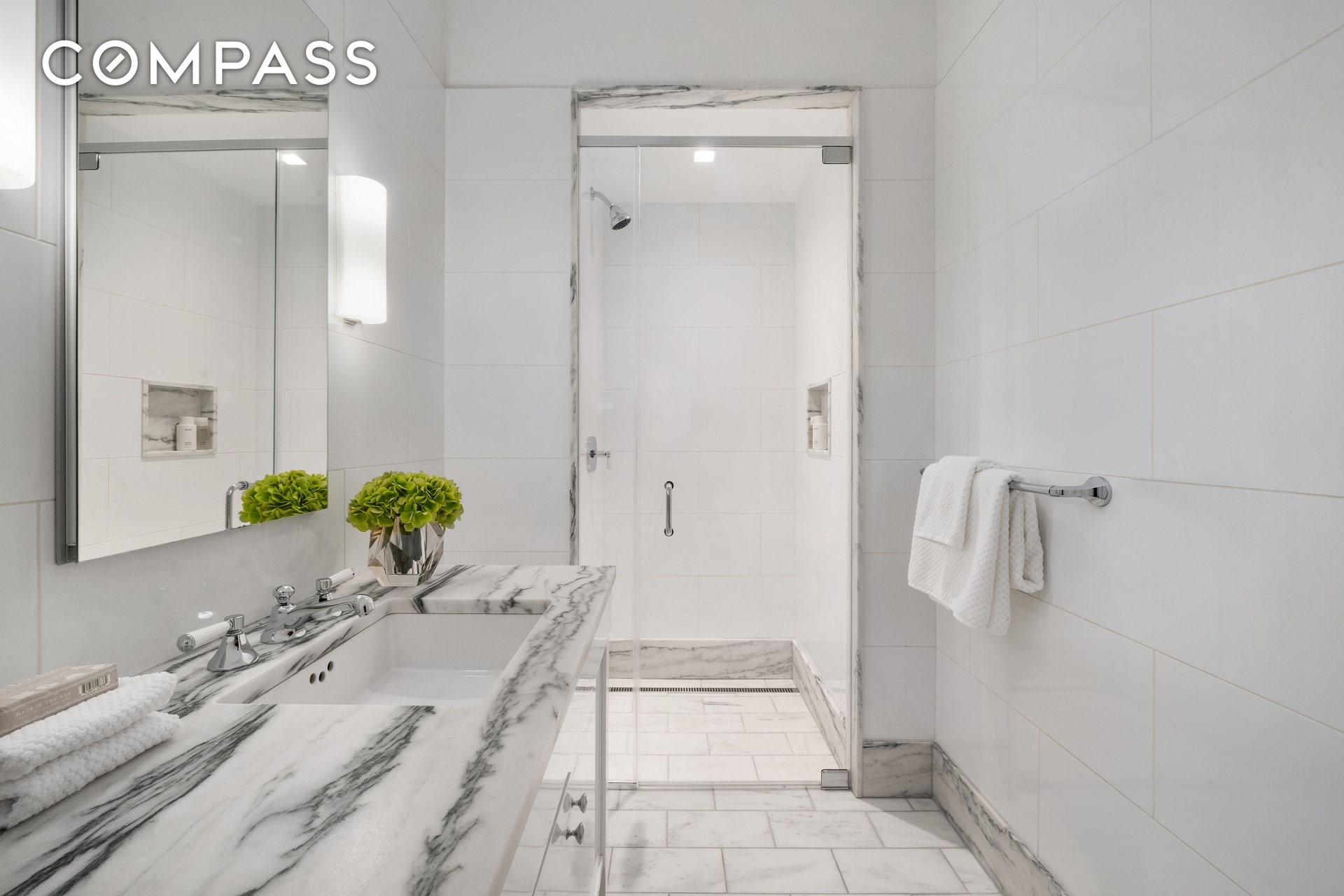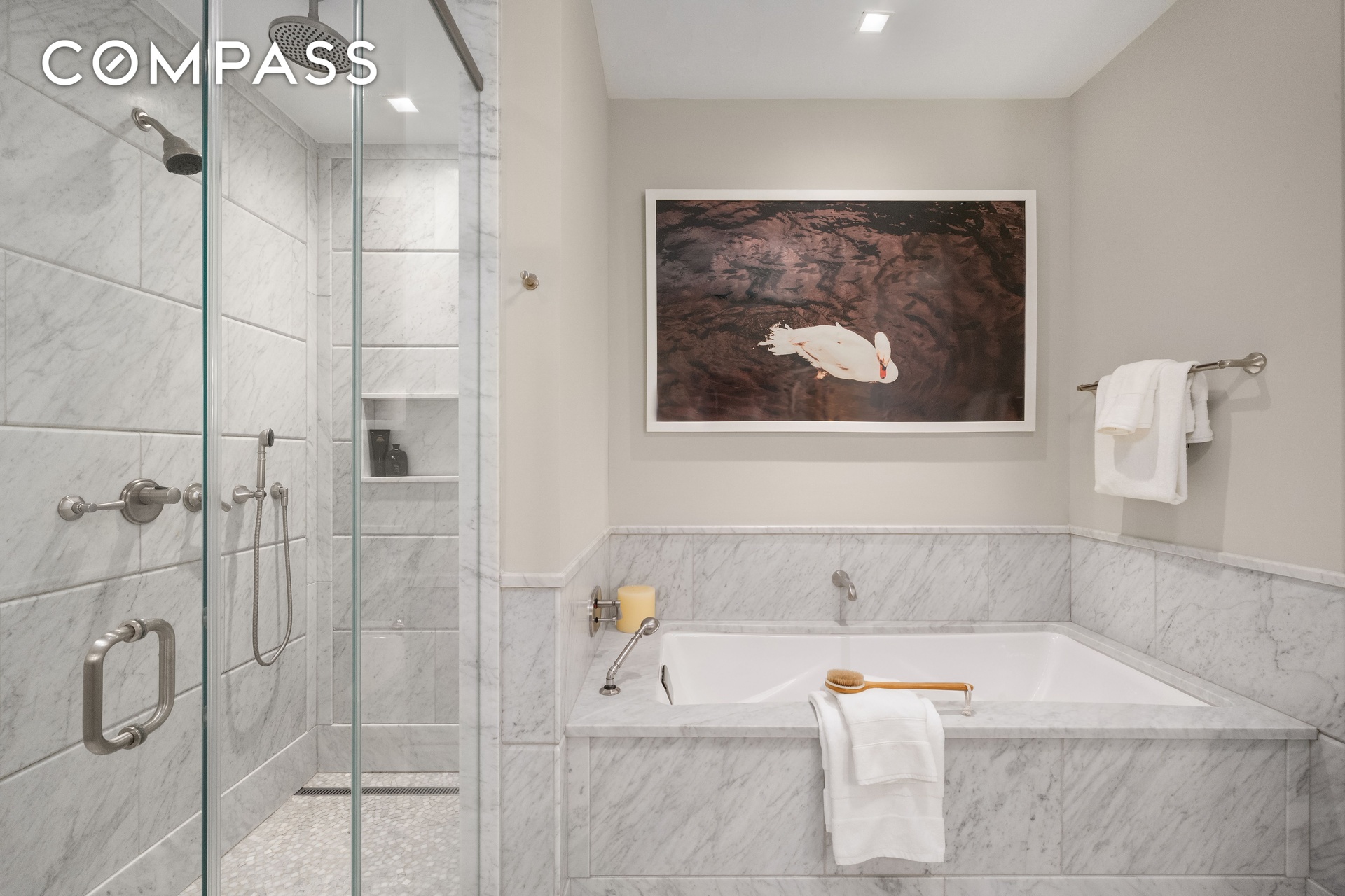 The left wing of the apartment is dedicated to the serene primary suite, an airy retreat flooded with natural light. This tranquil haven features three custom walk-in closets and a spa-inspired bathroom. Indulge in the soaking tub, rejuvenate in the oversized standing shower, and enjoy the dual sink vanity, all crafted for a seamless blend of sophistication and comfort.