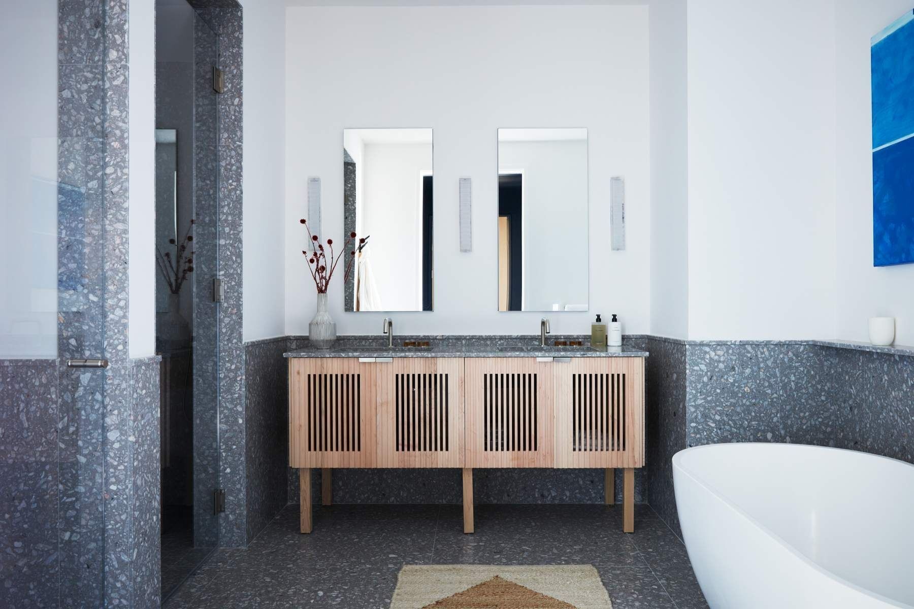 The primary suite, with its views of the East River features a large walk-in closet and an en-suite bathroom with Agglo Ceppo honed stone walls, flooring and countertops, brushed nickel shower controls, a freestanding soaking tub, and a custom-slatted white maple double vanity with satin nickel pulls, deck-mounted faucets and oak controls.