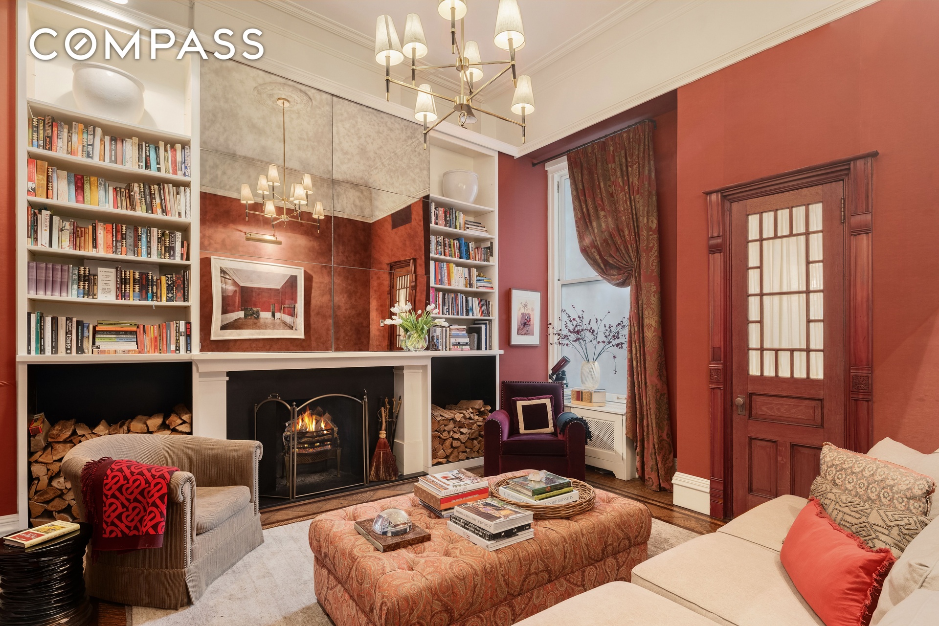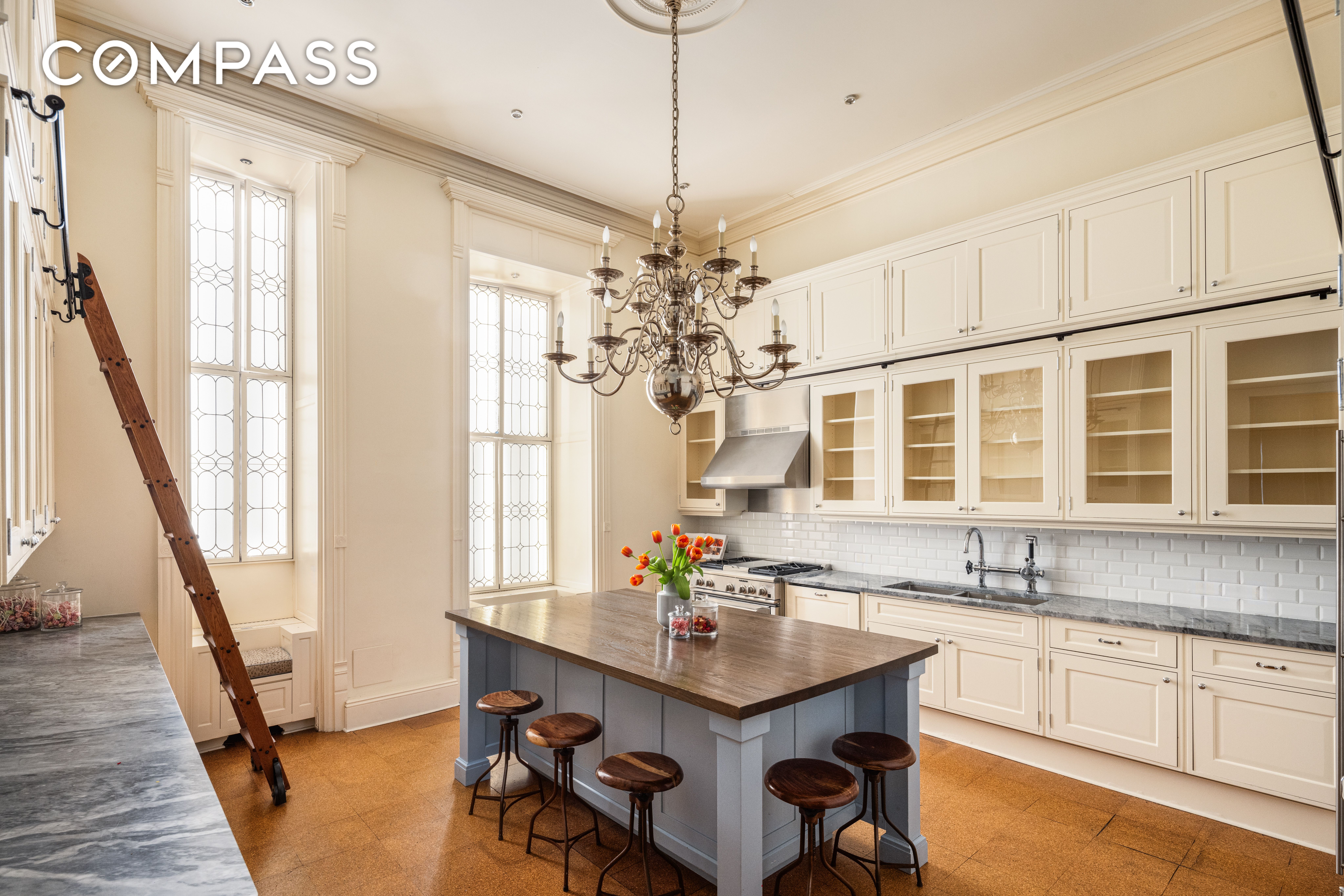 The formal dining room exudes elegance with lacquered, wainscoted walls and custom built-in window seating—perfect for hosting. Adjacent, the show-stopping eat-in kitchen features extensive oak cabinetry, a custom island, top-of-the-line integrated appliances, and a rolling library ladder for both charm and function.