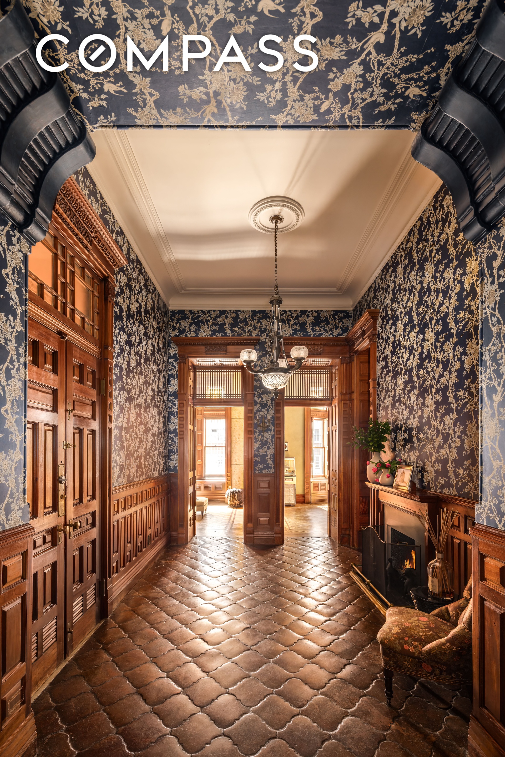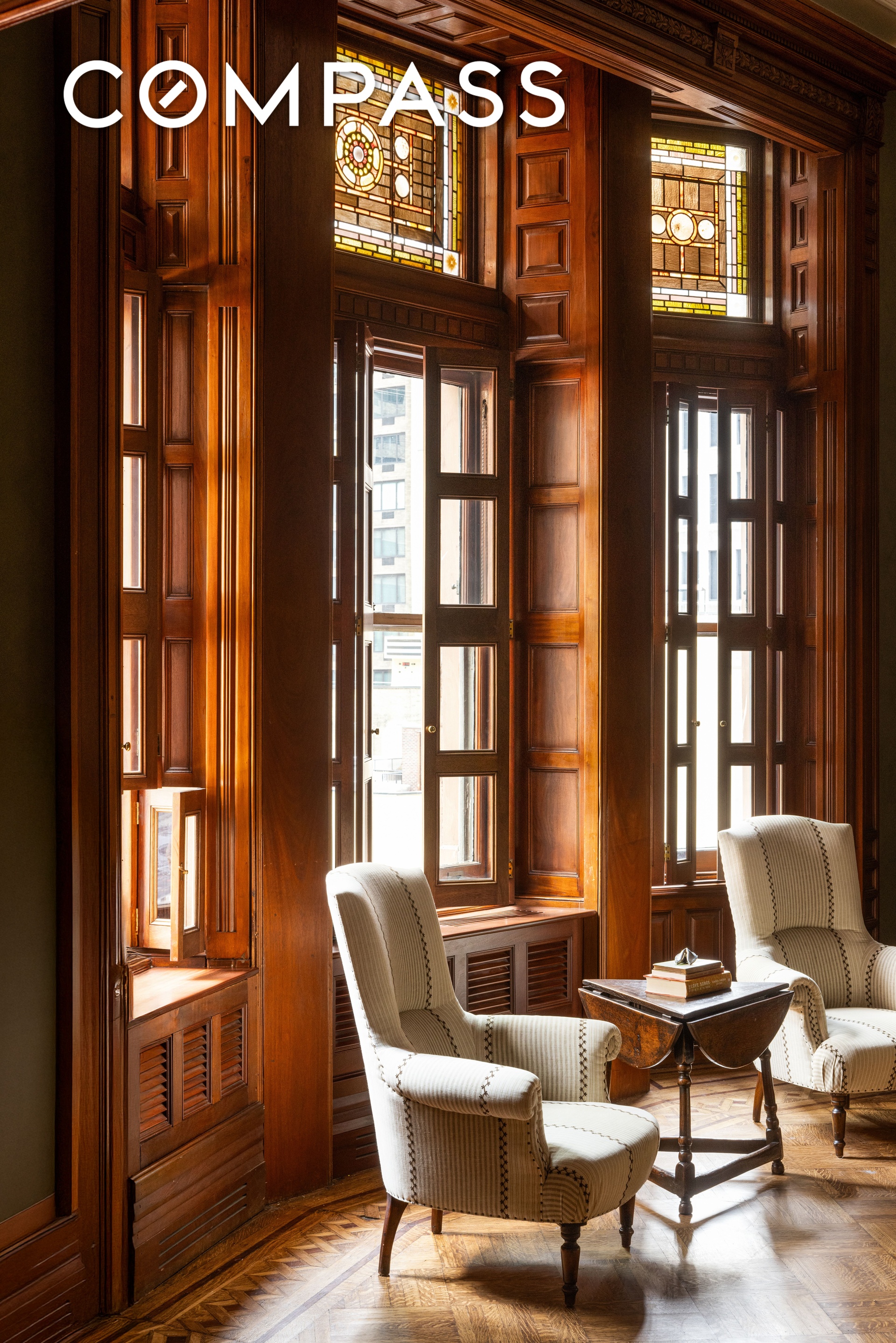 Upon entry, you're greeted by dual formal living rooms with soaring 14-foot ceilings, richly restored mahogany paneling, wood-burning fireplaces, and a stunning Tiffany Studio-designed bay window with leaded glass transoms. Ornately carved doorways and window frames, oak parquet floors, and plaster crown moldings elevate every corner.