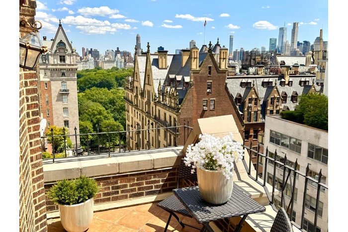 WOW! This jaw-dropping, one-of-a-kind masterpiece is a once-in-a-lifetime opportunity to own the best prewar one-bedroom on the Upper West Side! One of the original penthouses, this extraordinary trophy checks off every box, starting with the best location next to Central Park , in the finest landmark building, the iconic Park Royal. Next, you will love the spectacular and lofty layout with soaring 11-foot beamed ceilings adorned with huge crown moldings, and the icing on the cake is the incredible setback terrace that provides the ultimate private oasis with magical panoramic park and city views to enjoy relaxing, entertaining, sunrises and sunsets. Inside there is an enormous and dazzling 29-foot corner living room and luxuriously large corner bedroom where you will also enjoy the sweeping views and sunblasted southeast exposure. Not to mention the breathtaking brand-new renovation including an enormous designer dream kitchen with exquisite custom cabinetry, Taj Mahal quartzite counters and backsplash, Bosch appliances, a tremendous dining peninsula that accommodates 5, and all the bells and whistles you dream about. There is a gorgeous marble bathroom, outstanding new white oak herringbone floors, and generous custom closets. You will have to see this “WOW” apartment to believe it, with unparalleled indoor-outdoor living, you can have it all -- an incomparable residence, the best location, and a private outdoor retreat. This one will take your breath away!