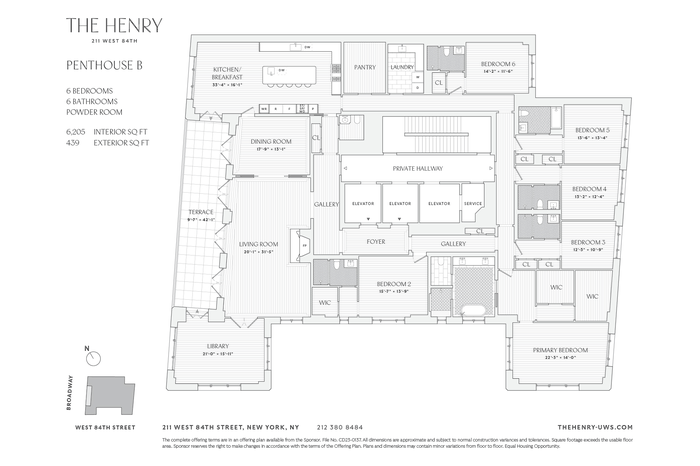 CLOSINGS BEGIN THIS WINTER. Penthouse B is a one-of-a-kind, full-floor, 6-bedroom, 6.5 bathroom home with amazing light and views. As you enter the residence, you are welcomed by a private vestibule that leads to a generous gallery. The west facing living room is flanked by the library to the South, and a beautiful formal dining room to the north. This enfilade of rooms opens to a generous terrace, perfect for seamless indoor/outdoor entertaining. The true chef’s kitchen has a large eat-in area with a west-facing picture window, and an adjacent oversized pantry. The primary bedroom sits on the southeast corner and has two dressing room size closets, and a five-fixture bath with a freestanding tub in front of a south facing window. Five additional bedrooms, all with ensuite baths, are flexible and can be used as bedrooms or entertaining spaces. There is a fully vented laundry room with a sink and an elegant powder room discreetly tucked away.