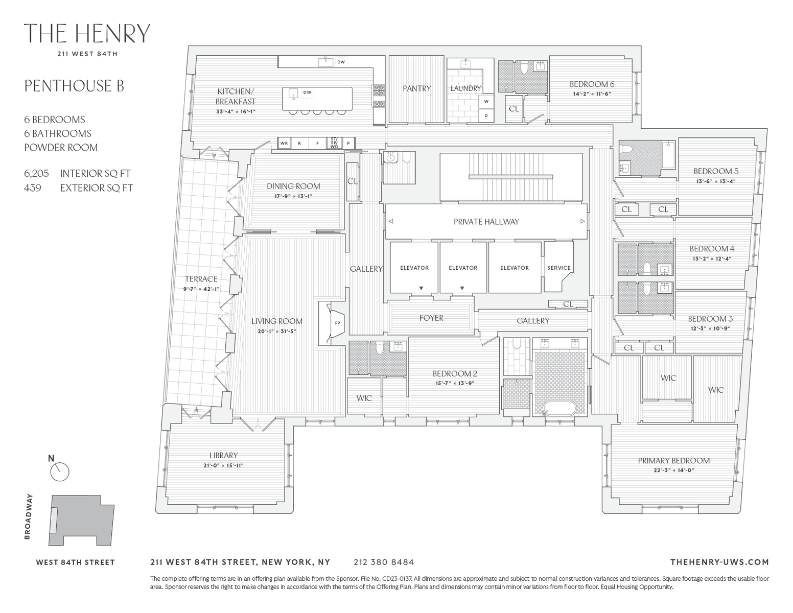 CLOSINGS BEGIN THIS FALL. Penthouse B is a one-of-a-kind, full-floor, 6-bedroom, 6.5 bathroom home with amazing light and views. As you enter the residence, you are welcomed by a private vestibule that leads to a generous gallery. The west facing living room is flanked by the library to the South, and a beautiful formal dining room to the north. This enfilade of rooms opens to a generous terrace, perfect for seamless indoor/outdoor entertaining. The true chef’s kitchen has a large eat-in area with a west-facing picture window, and an adjacent oversized pantry. The primary bedroom sits on the southeast corner and has two dressing room size closets, and a five-fixture bath with a freestanding tub in front of a south facing window. Five additional bedrooms, all with ensuite baths, are flexible and can be used as bedrooms or entertaining spaces. There is a fully vented laundry room with a sink and an elegant powder room discreetly tucked away.