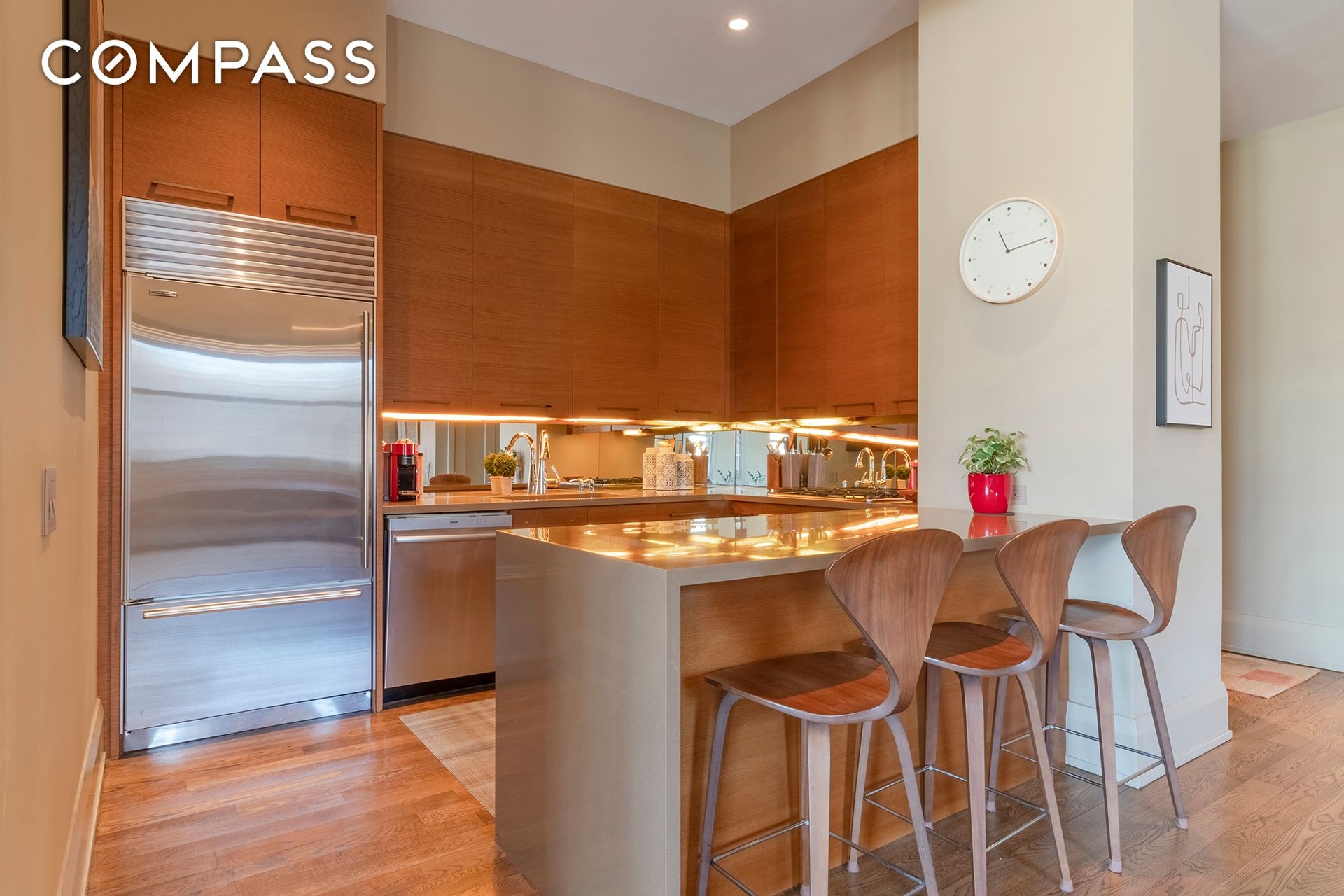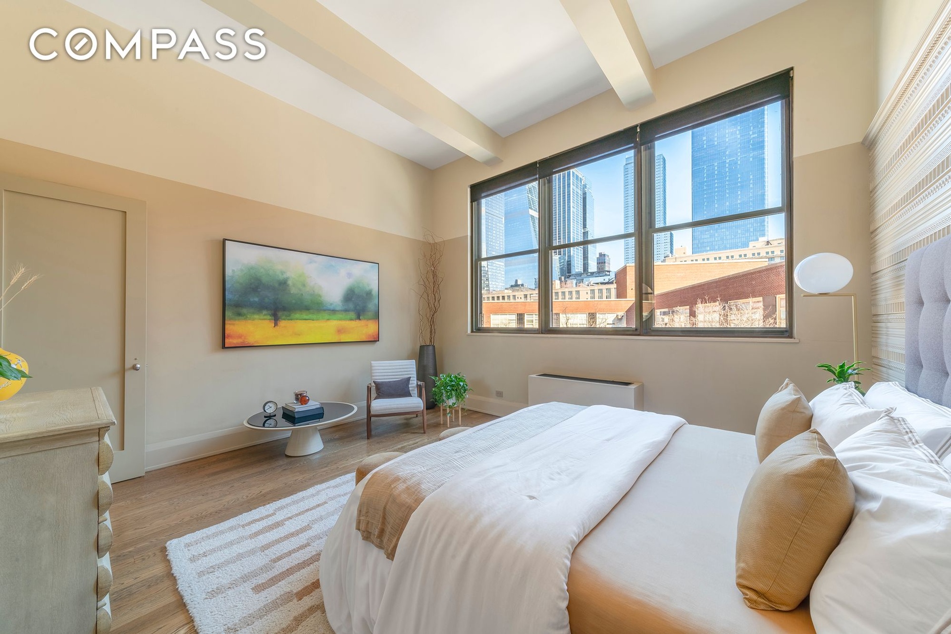The main feature is a 30’ x 20’ great room with 12’6” ceilings and six large windows offering views of Hudson Yards. The upgraded kitchen includes stainless steel appliances, a Sub-Zero refrigerator, a Bosch dishwasher, and a vented GE Profile range, with a nearly 10’ island for ample space and storage.