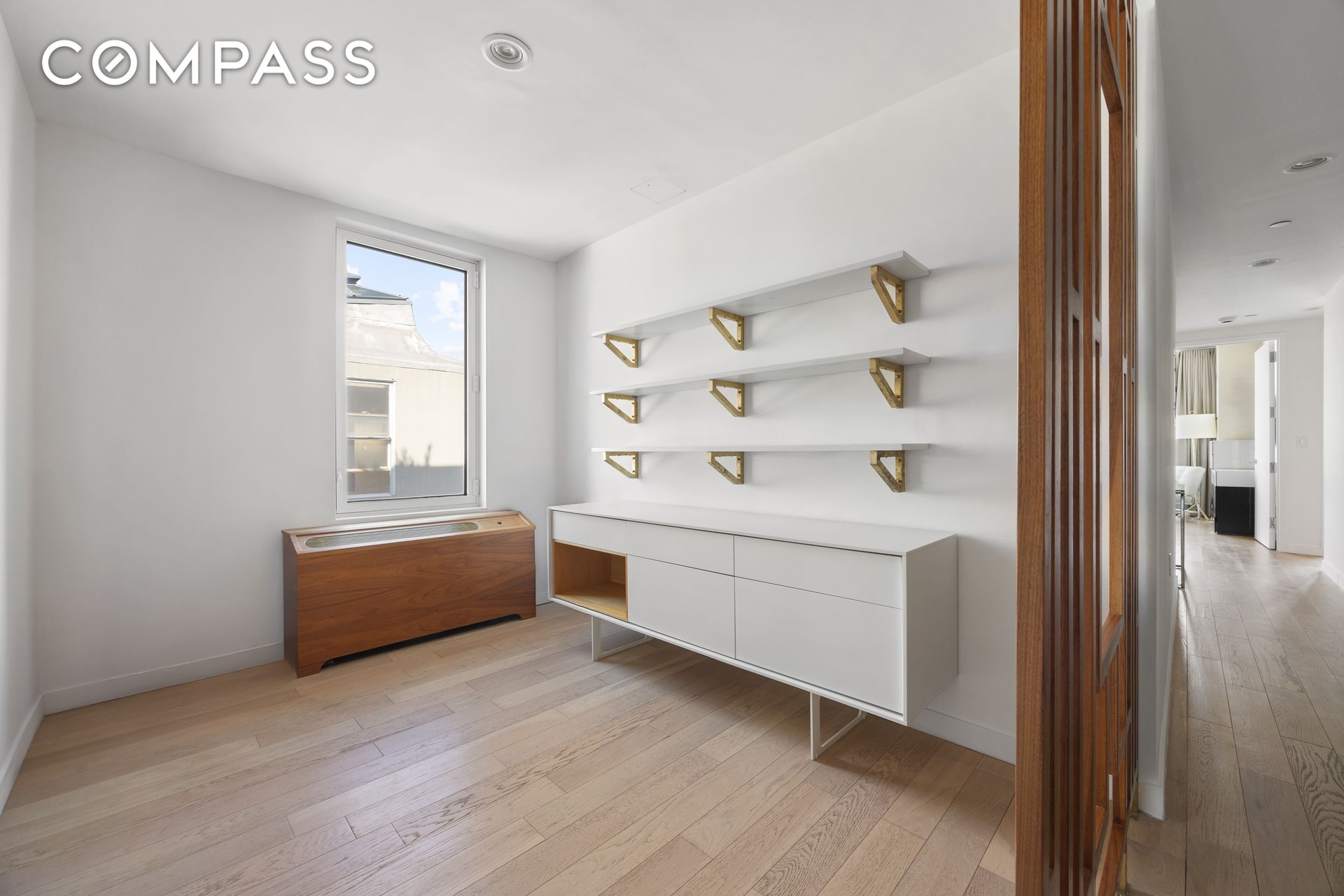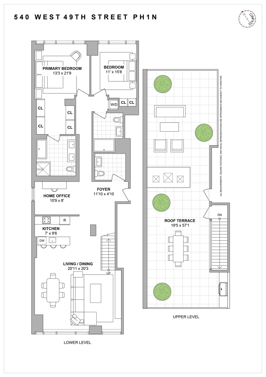 PH1N at 540 W 49th St, offers 1,625-square-foot of interior space with 2 bedrooms and 2.5 bathrooms, as well as an additional 1,018 sq ft private roof terrace. This home boasts both northern and southern exposures, ensuring ample natural light throughout the day. In addition to the two well-sized bedrooms, PH1N also boasts a windowed home office.