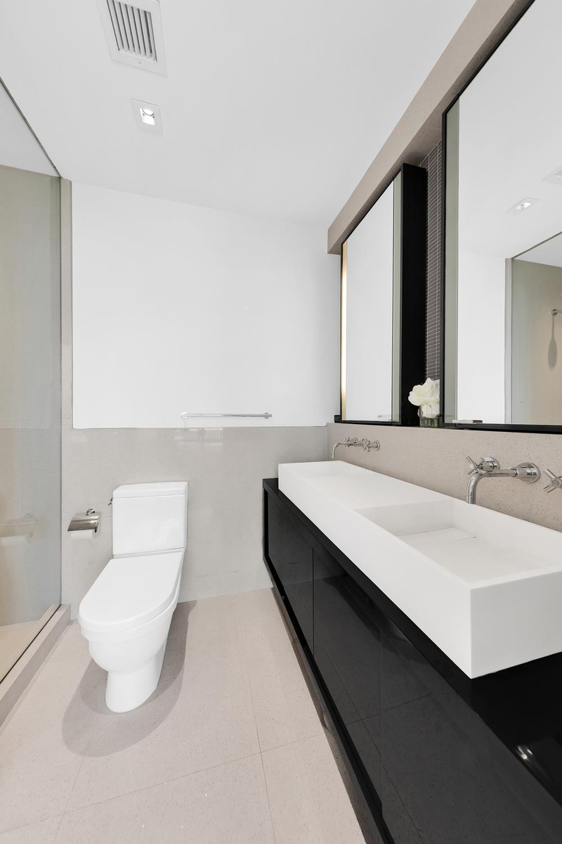 At the heart of the home, the Italian chef’s kitchen impresses with sleek white lacquer cabinetry, premium Bosch appliances, and a Sub-Zero refrigerator. An in-unit washer and dryer adds everyday convenience.