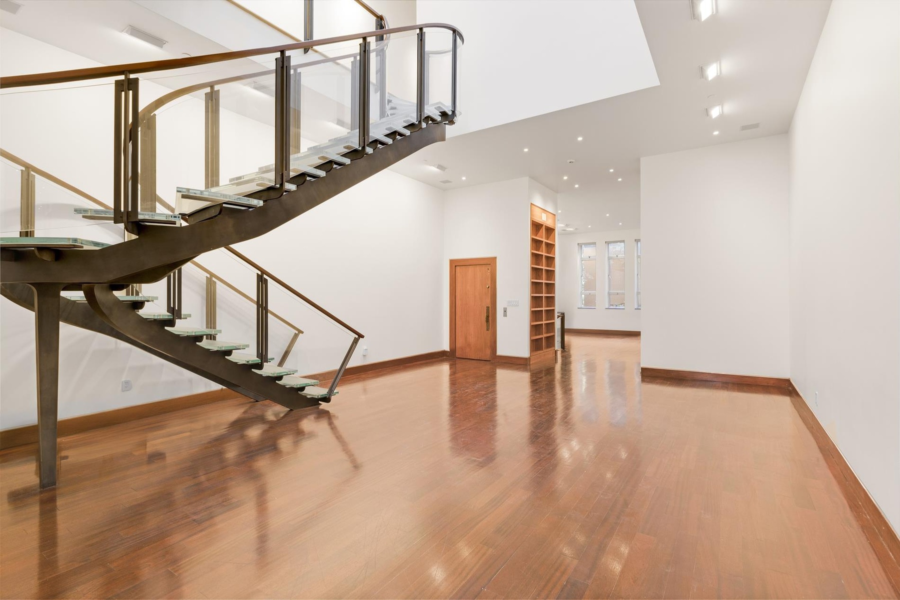 Just below, a dining area and kitchen offer generous proportions for entertaining. A terrace on this level provides a tranquil outdoor retreat in the heart of the city.