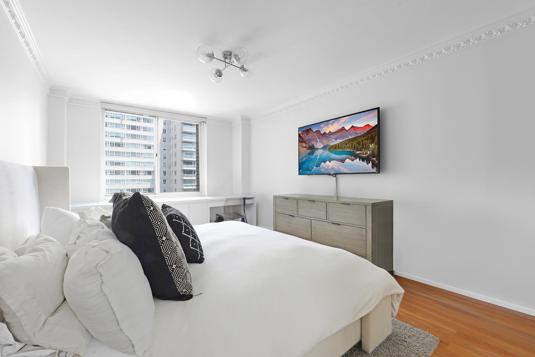 The apartment features a gracious layout with an expansive living and dining area, ideal for entertaining or relaxing at home. Oversized windows bathe the space in natural light and offer open city views. The sleek, modern kitchen is equipped with top-of-the-line stainless steel appliances, granite countertops, and ample cabinetry.