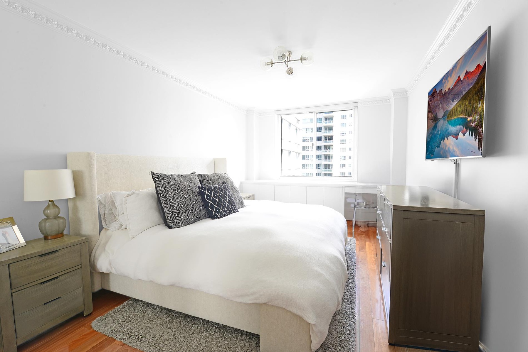 The king-sized primary bedroom includes a large closet and en-suite bathroom. The second bedroom is generously sized and can function as a guest room, nursery, or home office.