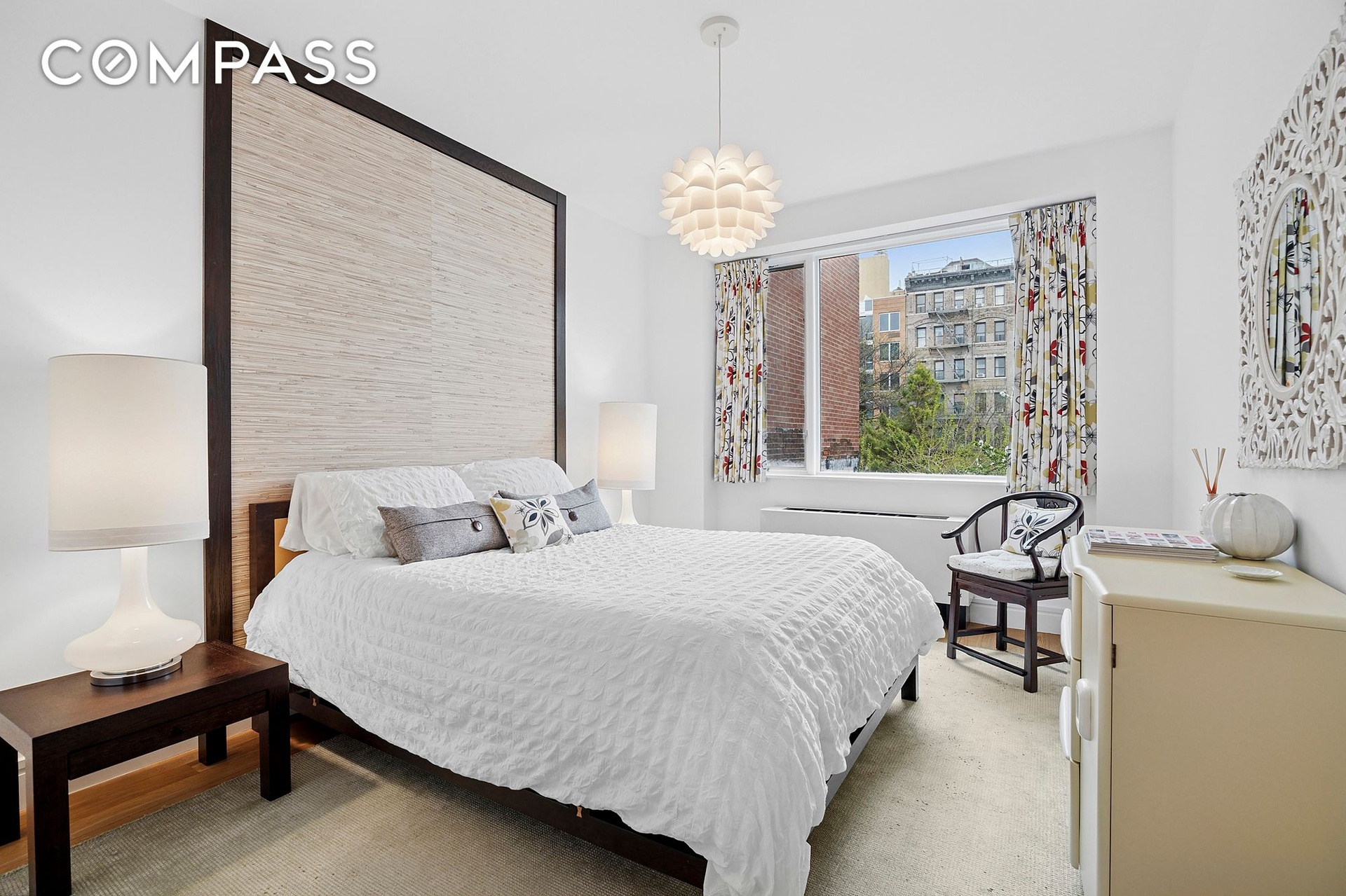 This high ceiling loft-like home offers two large bedrooms in the back with oversized north facing windows taking in the beautiful vista of open community gardens that go all the way to Ninth Street. The primary bedroom has a walk-in closet / dressing area and en suite bath with a spa shower. The unit also features a washer dryer, rare central heat HVAC, key locked elevator access and a video intercom system. The large second bath features an extra deep soaking tub. There is also a deeded large basement storage space that transfers with the unit. East 8th Street is a quiet tree lined street just half a block from Tomkins Square Park surrounded by great restaurants, nightlife, culture and the year round Tompkins Square Greenmarket.