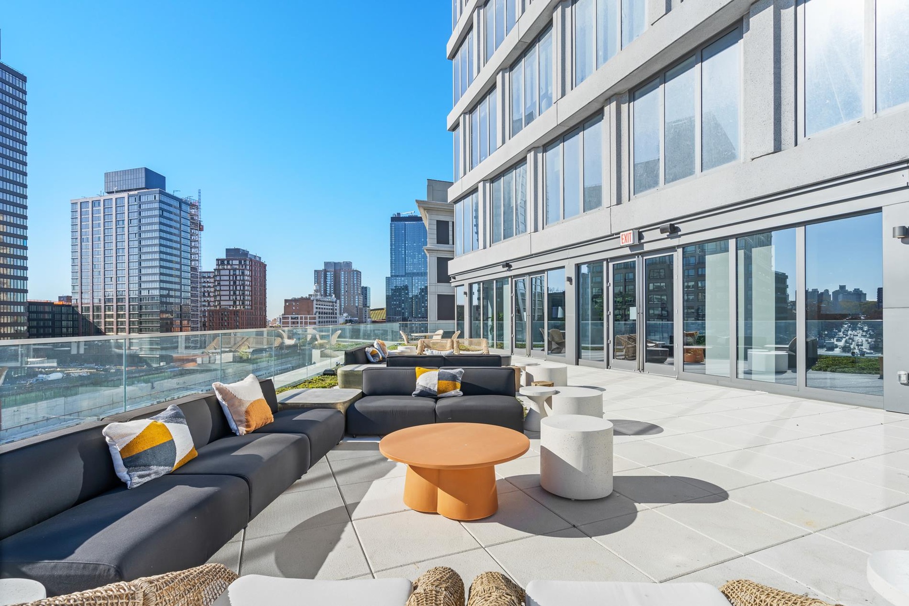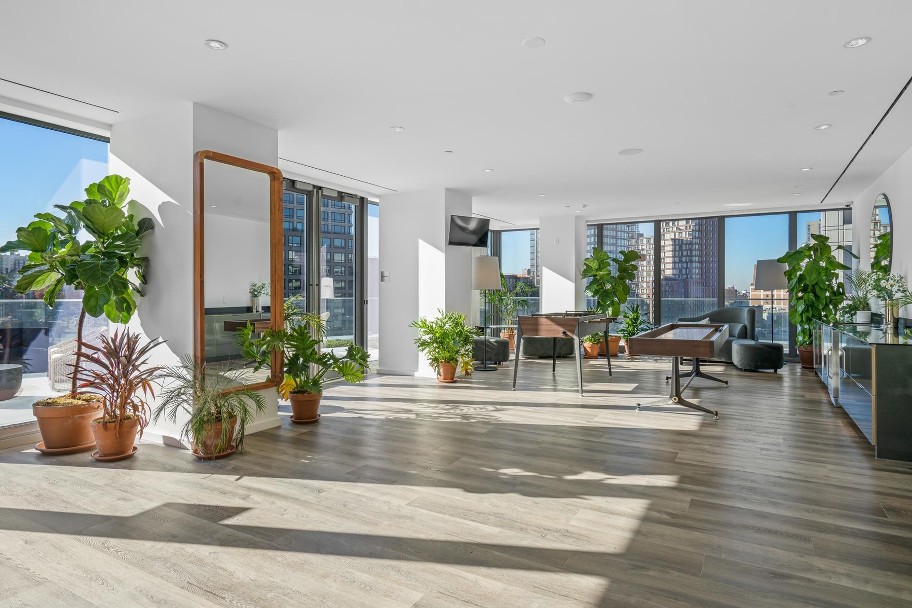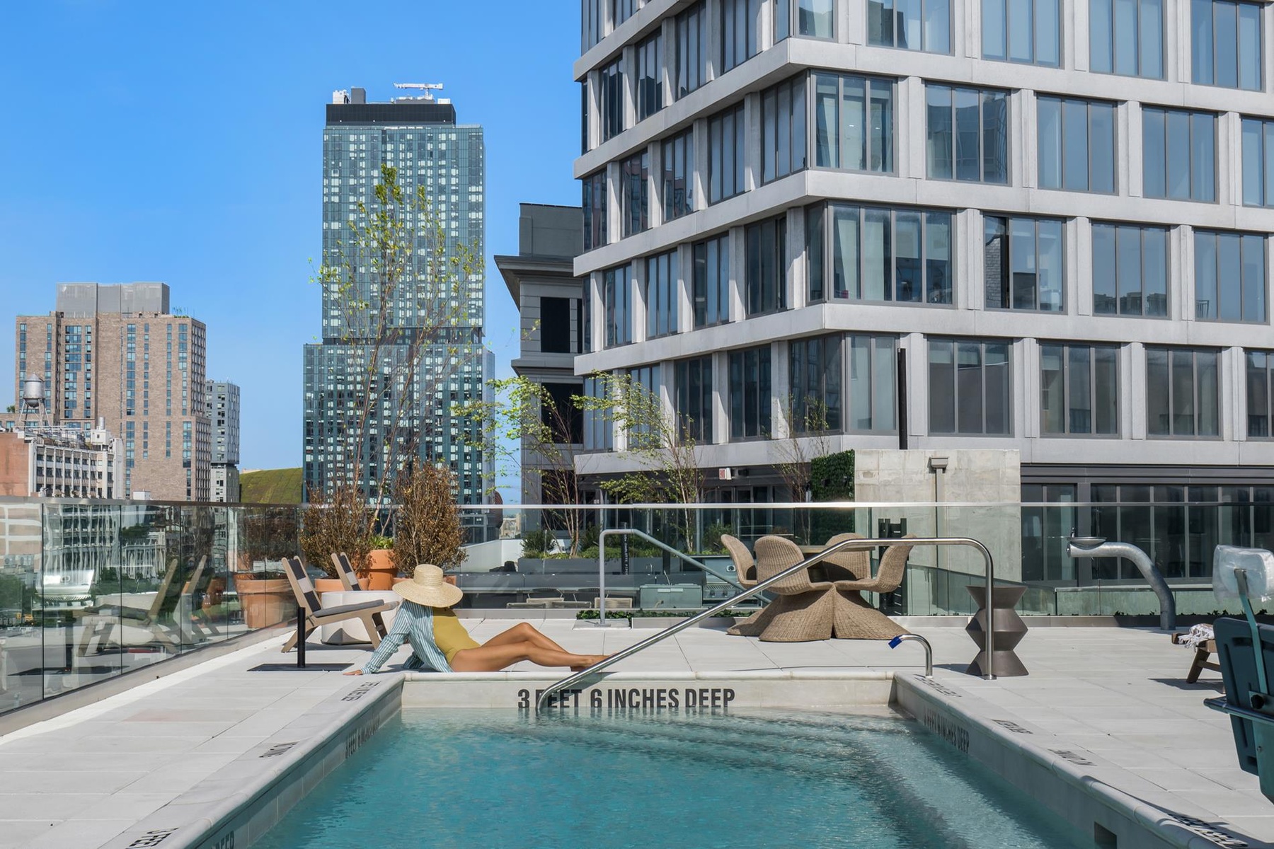 The building's amenities include a bright fitness center, game room, golf simulator, coworking lounge, conference rooms, rooftop sun deck, and a private outdoor pool located on the fifth floor. The building also offers bike storage, and private storage cages for rent– with a door person present seven days a week from 11AM to 7PM.