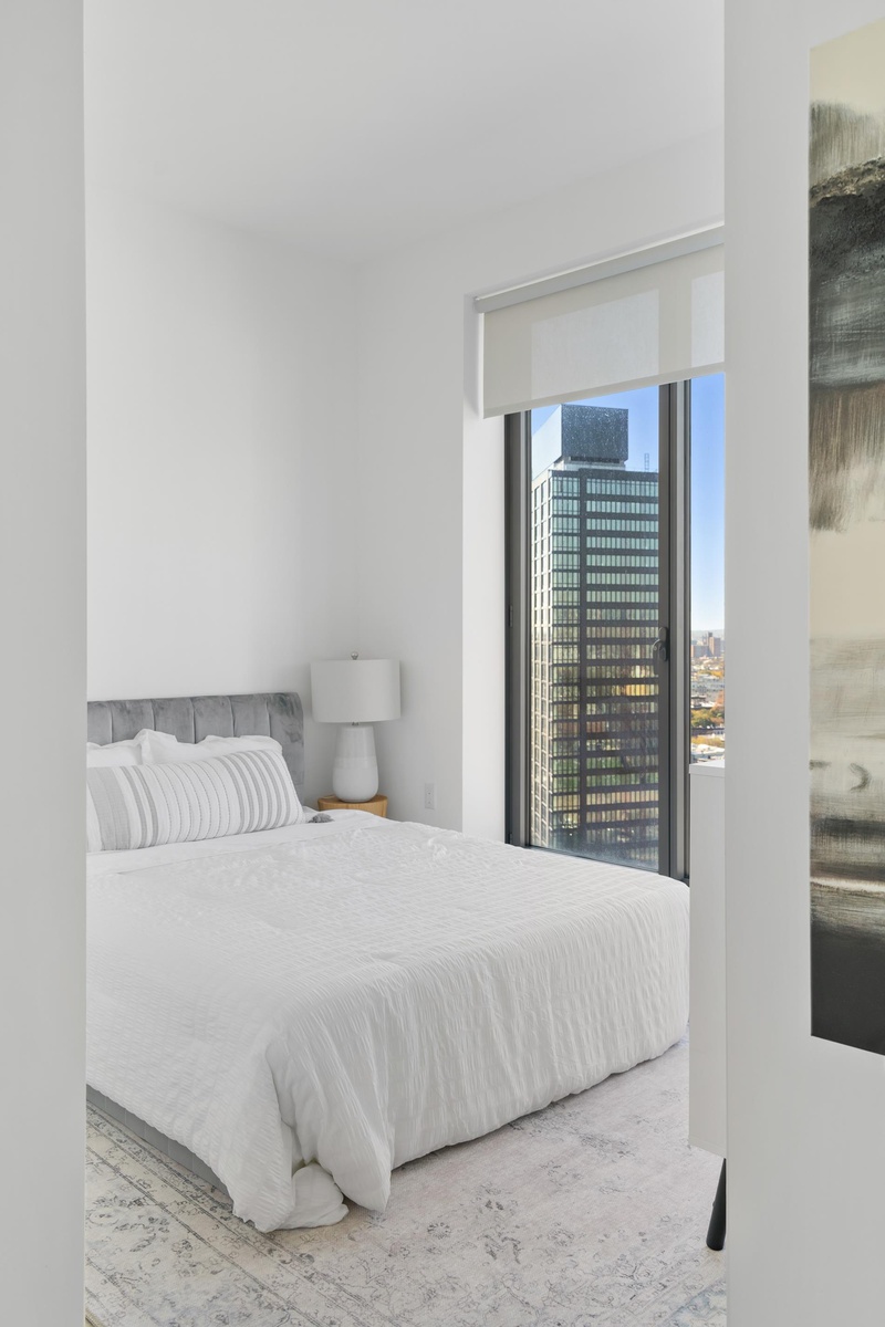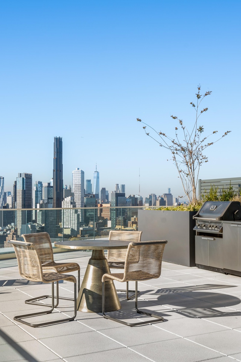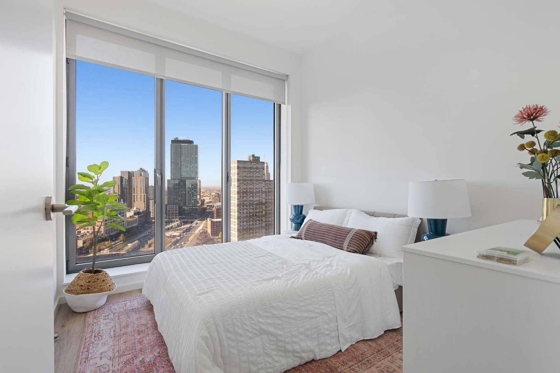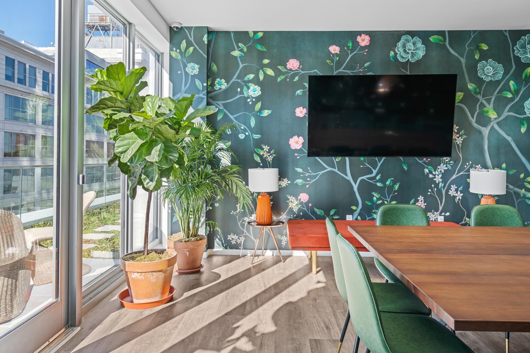 The building's amenities include a bright fitness center, game room, golf simulator, coworking lounge, conference rooms, rooftop sun deck, and a private outdoor pool located on the fifth floor. The building also offers bike storage, and private storage cages for rent– with a door person present seven days a week from 11AM to 7PM.