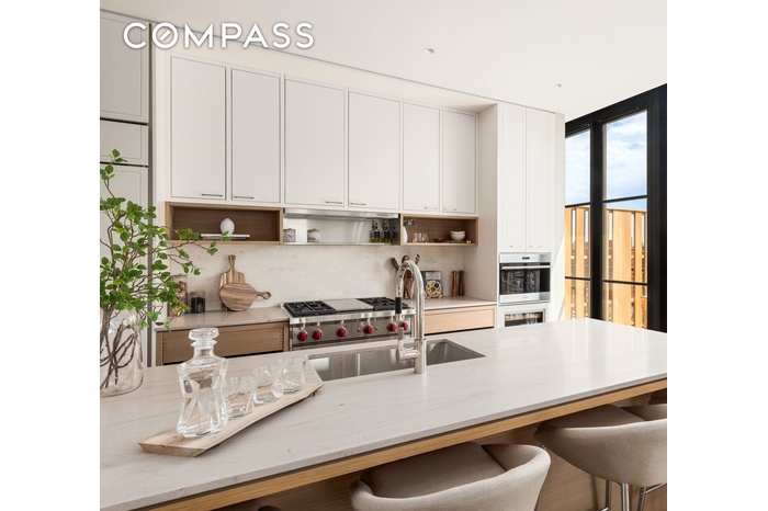 Enhanced by impressive south and east facing floor-to-ceiling casement windows offering expansive views, this spacious living room is an entertainer’s dream. The open chefs kitchen has a large pantry, custom Italian solid white oak cabinets with exposed dovetail joinery, and under-cabinet lighting. Brazilian desert quartzite countertops are accented with a marble backsplash, and the stainless steel appliances include a Wolf range with grill & vented Broan range hood, speed oven, Sub-Zero refrigerator, wine fridge, dishwasher, and stainless steel sink with insinkerator. Additionally, a Brazilian desert quartzite island provides extra counter space and seating for four.