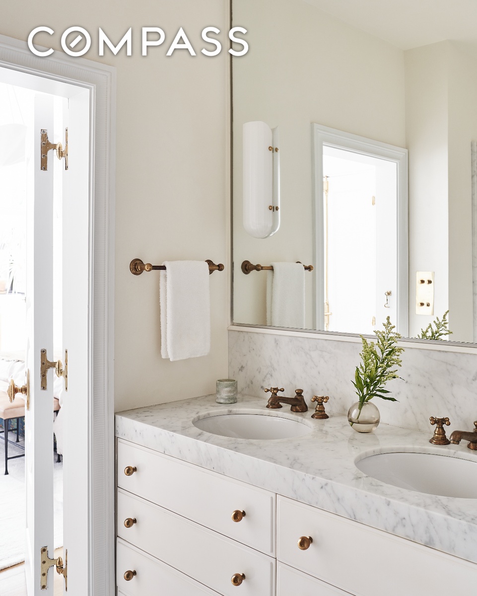 The home’s primary bedroom suite is absolute perfection, with a gas fireplace clad in vein-cut limestone, multiple closets including a large walk-in, and a chic en-suite bath finished in Carrara marble with radiant heated mosaic tile floors, double sink vanity, a clawfoot soaking tub, oversized shower, and brass fixtures throughout. A private solarium extends the primary suite and is perfect for a sitting room or office and provides access to the private terrace with stone flooring and a custom trellis by Harrison Green. The second bedroom also has access to this lovely outdoor space and has access to a second full bathroom with vintage-inspired finishes. Central HVAC, a built-in Savant system, central humidification, washer/dryer, and designer lighting controls complete this turn-key residence.