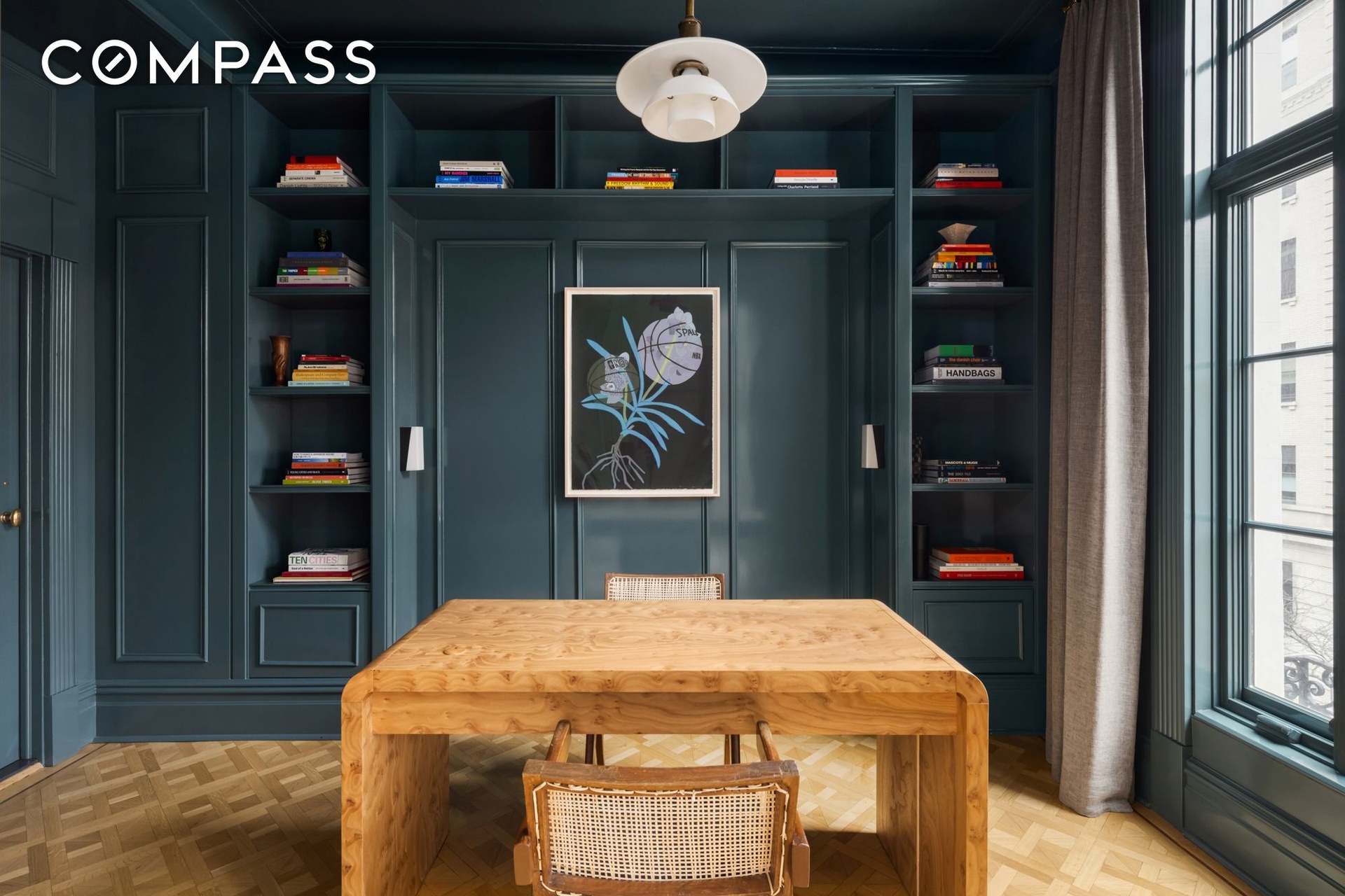 A direct elevator entry opens onto a wide gallery, dividing public and private spaces. The living room is perfectly proportioned and features a full wall of glass overlooking Gramercy Park below, as well as a gas fireplace clad in marble, intricately-patterned parquet de Versailles hardwood floors, and custom moldings. The custom lacquered library is adjacent and extends across the unit’s 27 feet of width, with perfect park views and a chic powder room. The formal dining room is wrapped in custom moldings and has a custom lacquer bar, perfect for beverage and stemware storage and display. An elegant kitchen is discreetly located off the dining room, complete with custom cabinetry, marble and butcher block countertops, a range by Lacanche, and refrigeration by Sub-Zero.