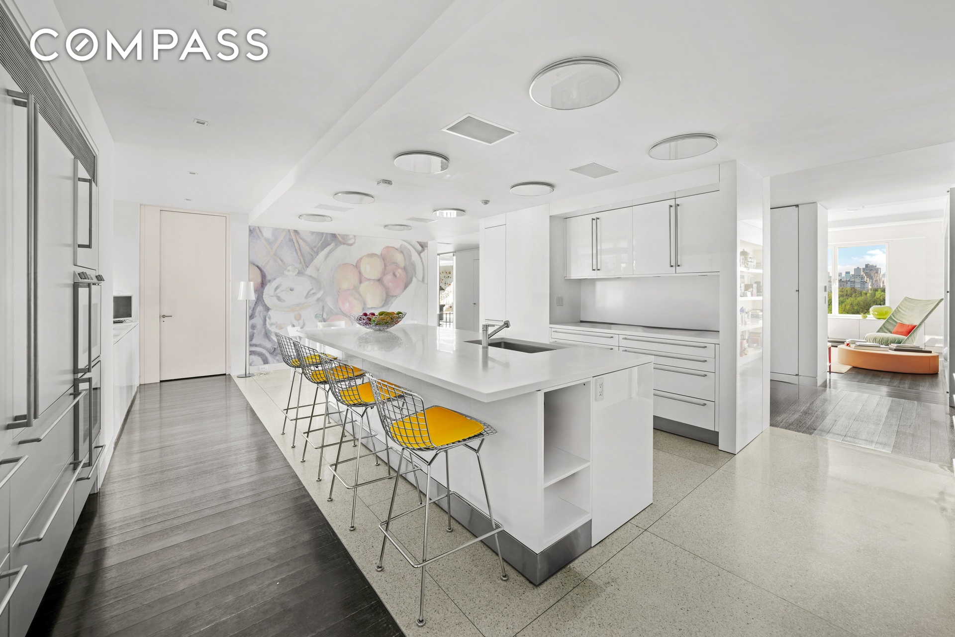 The custom Bulthaup chef’s kitchen features a dining area with eastern and western views. The kitchen is outfitted with a Viking range, two Gaggenau ovens, two Sub-Zero refrigerators, and a Sub-Zero wine refrigerator. Adjacent to the kitchen, with a private entrance, is a staff room, laundry room, full windowed bathroom, and extensive storage.