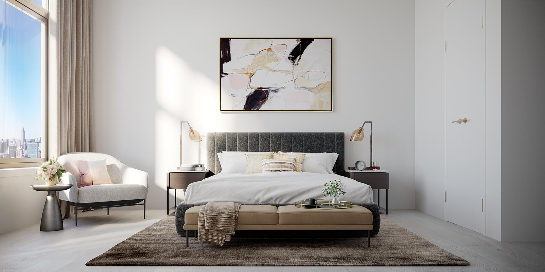 The spacious bedroom easily accommodates a king-size bed and offers captivating water and Downtown Manhattan views. The bathroom provides high-end finishes, including grey ash veneer, a white marble vanity with elegant light bronze Kohler Purist fixtures, a custom recessed medicine cabinet, a luxurious Kohler Underscore tub, a Kohler Verticyl undermount sink, and a Toto Eco Supreme one-piece toilet. For added convenience, a Bosch washer and dryer are also included.