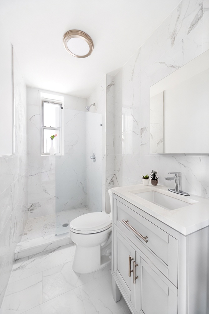 The large eat-in kitchen features quartz counter-tops, custom cabinetry and all-new stainless-steel appliances. There's fantastic counter-space and pantry storage and a bright view over Saint Nicholas Avenue.