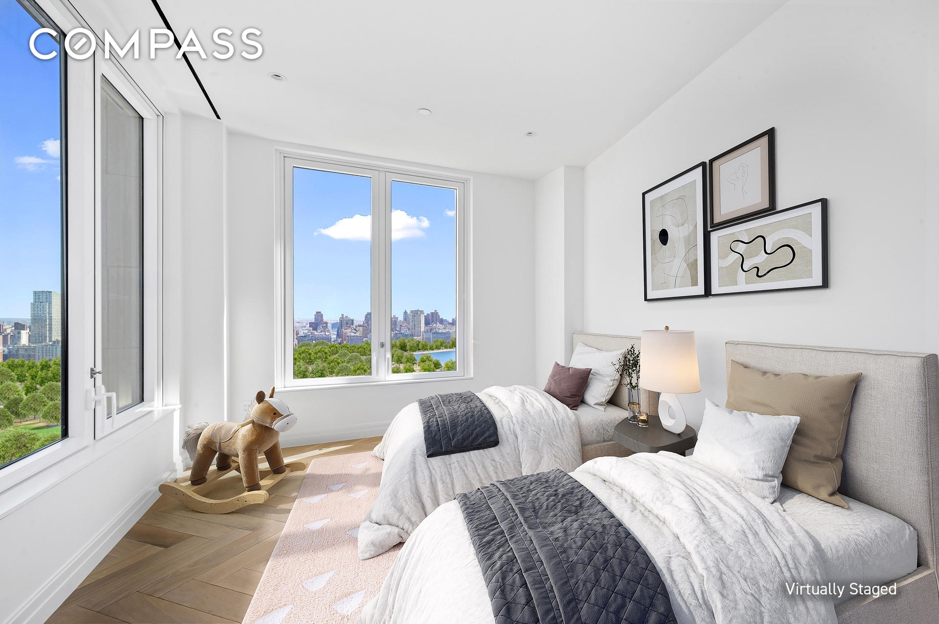 A windowed staircase leads to the upper level, where three secondary bedrooms offer incredible light, generous closets, and stunning Central Park views. Two of these bedrooms feature en-suite baths—one with a soaking tub and gray marble floors, the other with a large walk-in shower.