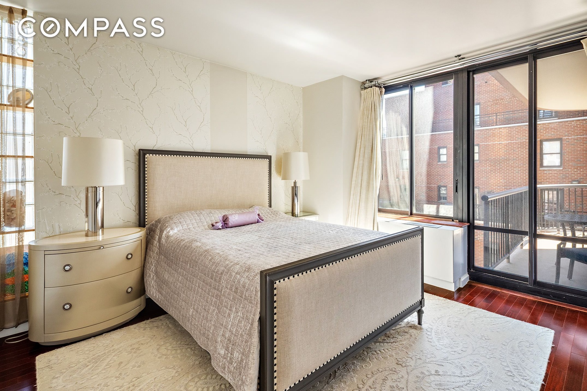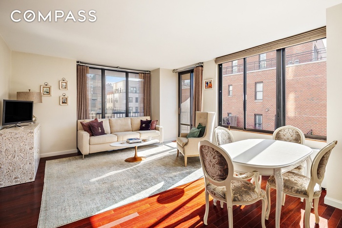 Nestled in the heart of Lenox Hill, this stunning 1-bedroom, 1-bathroom residence at The Rio Condominium offers breathtaking skyline views and an abundance of natural light from its east and north-facing exposures. Floor-to-ceiling windows illuminate the spacious living room, creating a bright and inviting atmosphere perfect for relaxation and entertainment. A private J-shaped terrace, accessible from the bedroom, serves as a serene retreat. The fully renovated kitchen boasts elegant cabinetry, sleek countertops, and premium stainless-steel appliances, including a Bertazzoni gas range and Bosch dishwasher. The spa-like bathroom features high-end finishes, with Gracious Home LACAVA fixtures and Roberto Cavalli floor tiles. Beautiful hardwood floors flow throughout the home, complemented by ample closet space with customizable Elfa shelving and designer-selected window treatments for a refined touch.