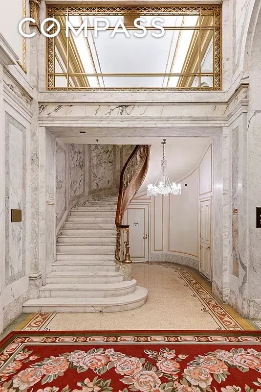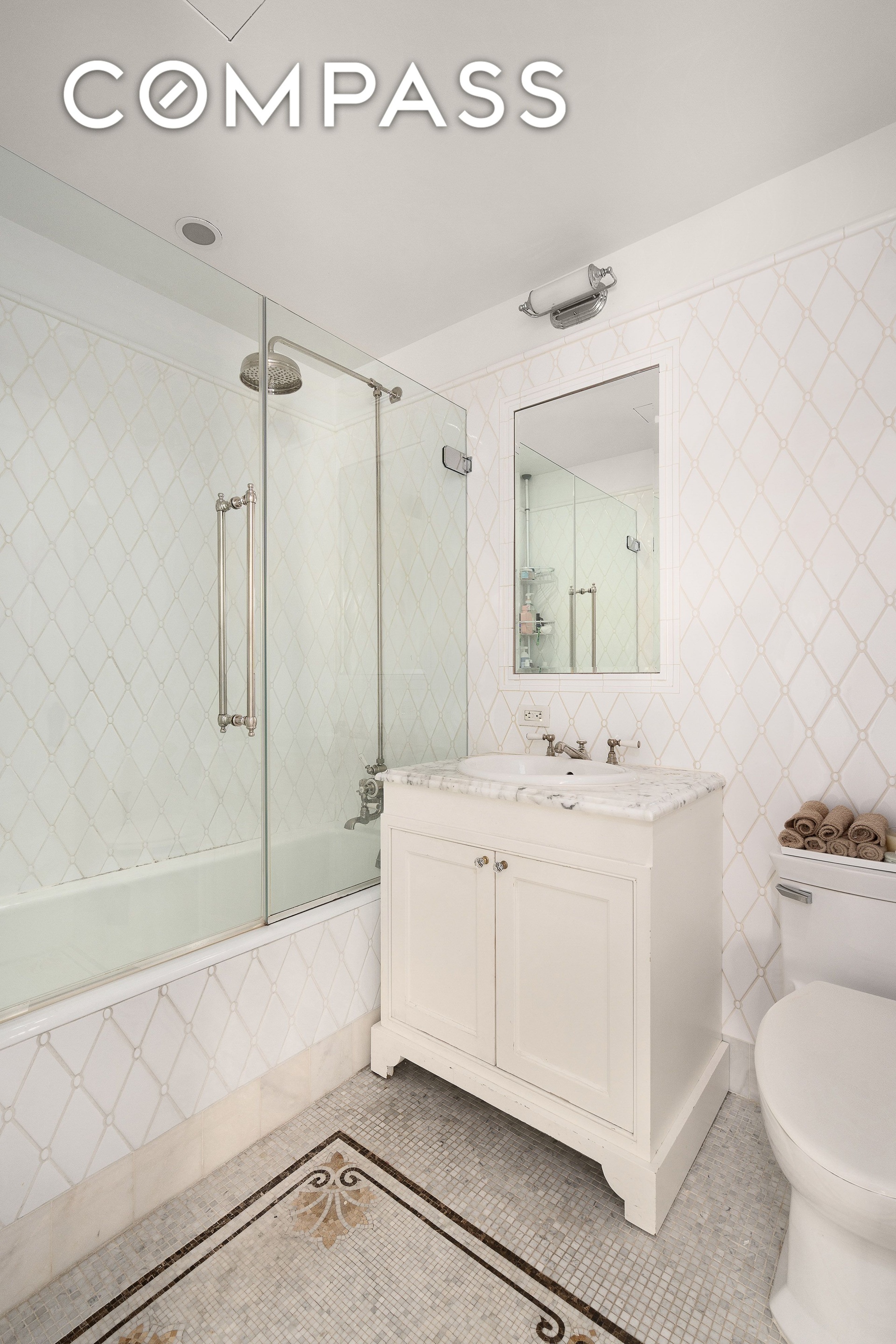 The spacious primary suite features a walk-in closet and a beautifully renovated en-suite bath with mosaic tile flooring inspired by the Plaza’s iconic lobby. Fixtures by LeFroy Brooks and Kohler, including the signature double P insignia, add a bespoke touch. Additional highlights include generous closet space, a second full bathroom, and the convenience of an in-unit washer and dryer.