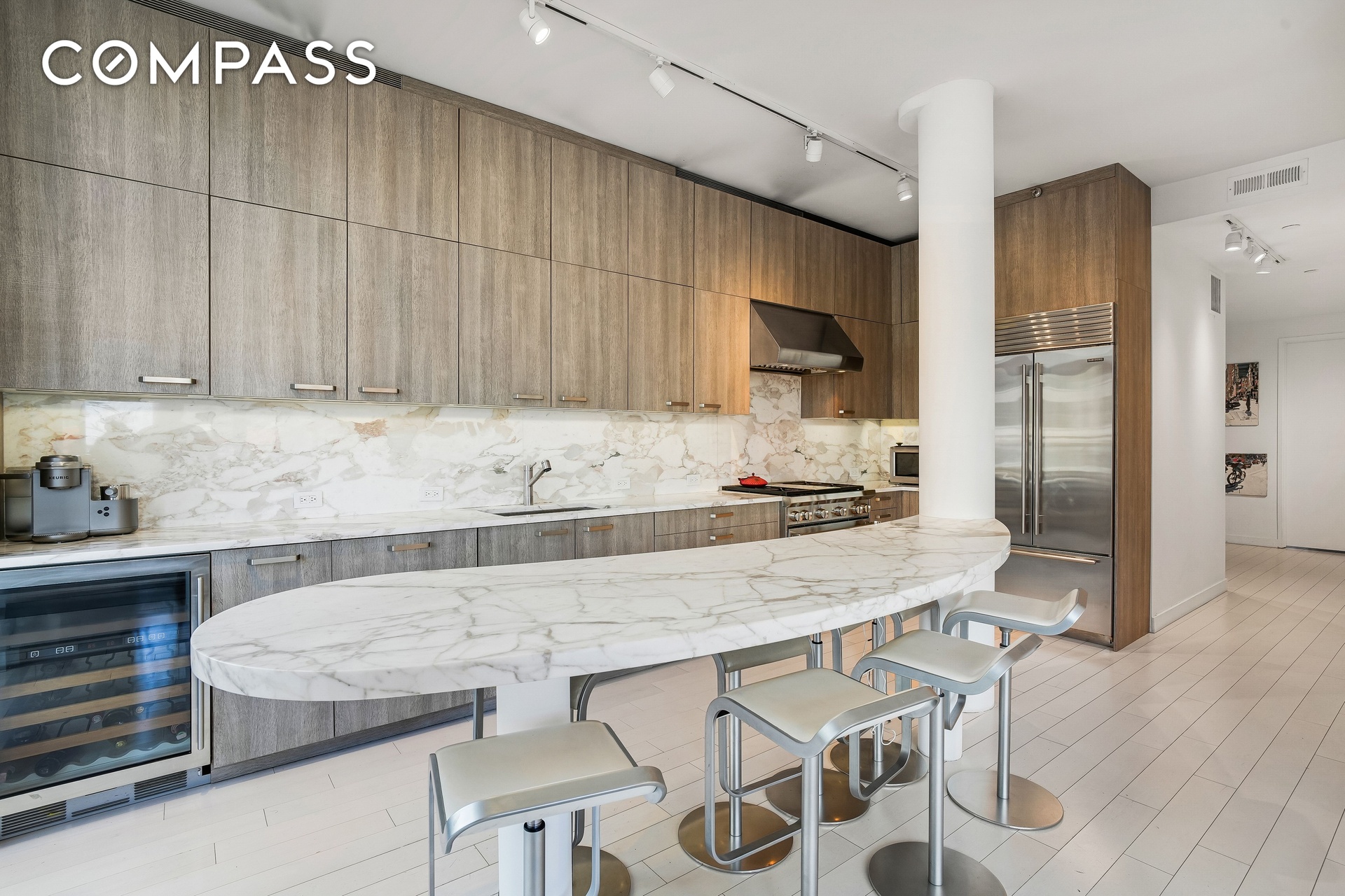 Inside, an open-concept layout is flooded with natural light from floor-to-ceiling windows. The chef’s kitchen features Sub-Zero, Wolf, and Miele appliances, a marble island, a wine fridge, and ample storage—ideal for effortless entertaining. The expansive living and dining areas flow directly onto the terrace, perfect for hosting or relaxing with open city views.
