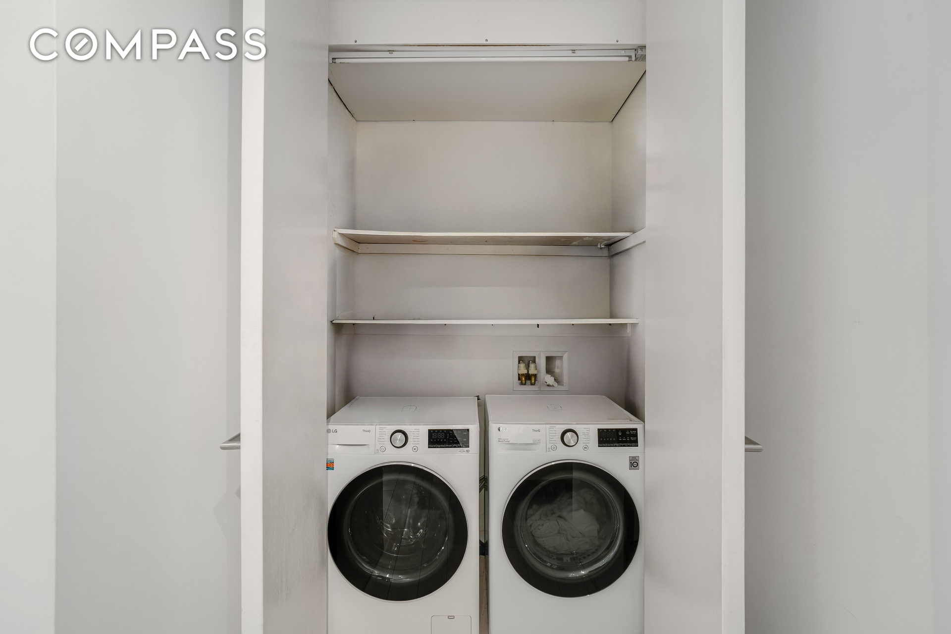 The serene primary suite includes built-ins, California Closets, a spa-like en-suite bath, and private terrace access. The second bedroom also offers an en-suite bath and terrace entry. Additional highlights include high ceilings, wide-plank hardwood floors, a stylish powder room, central A/C, and in-unit washer/dryer.