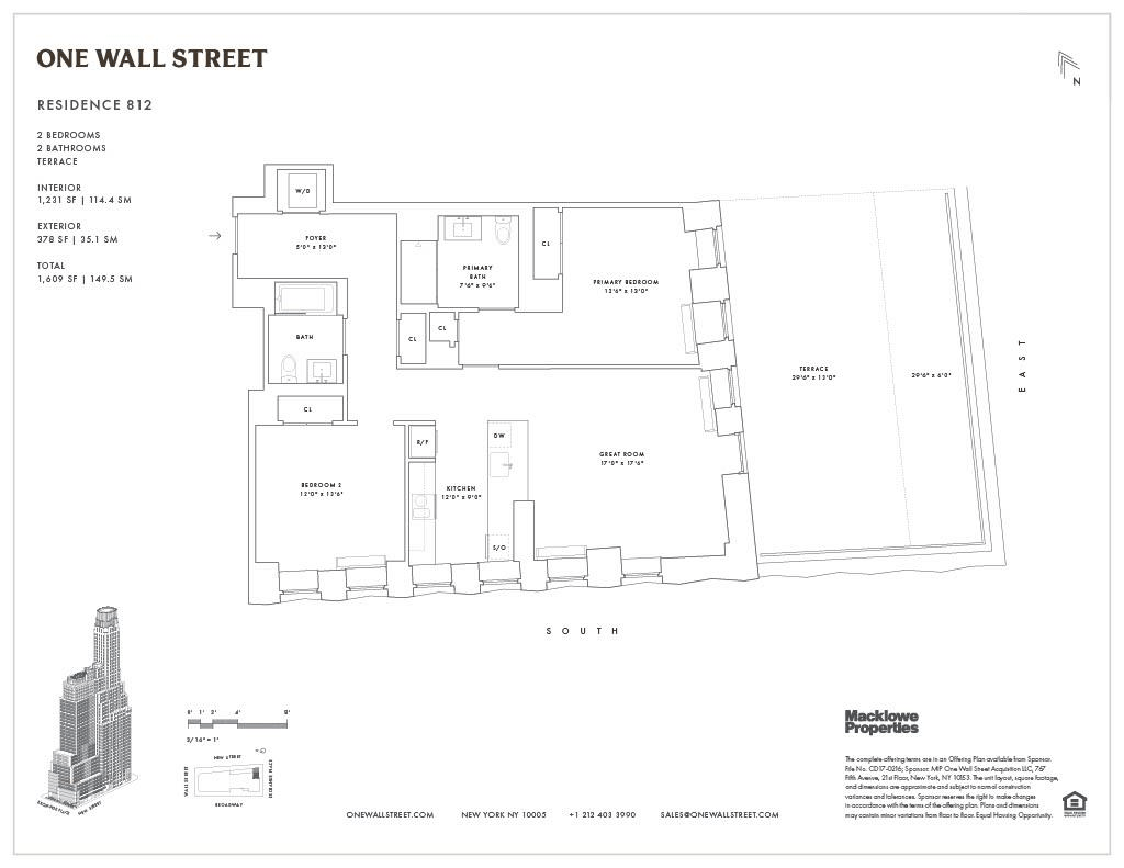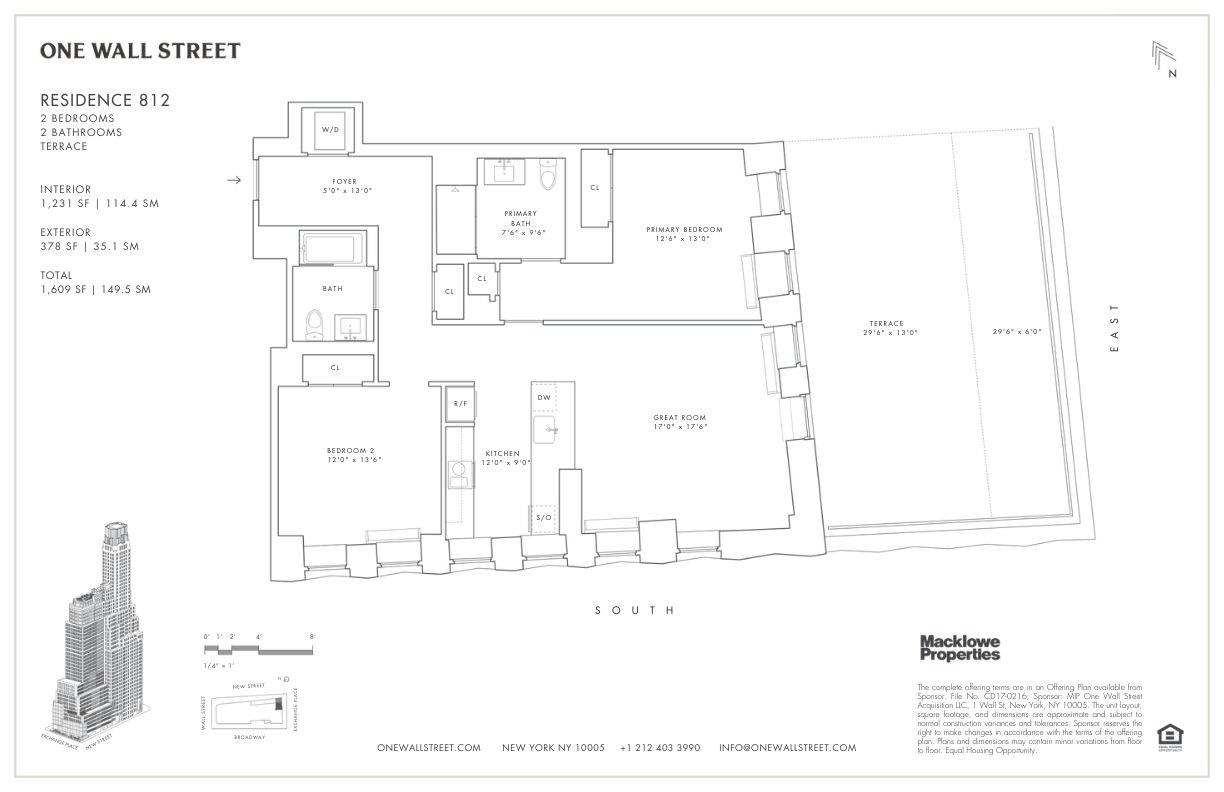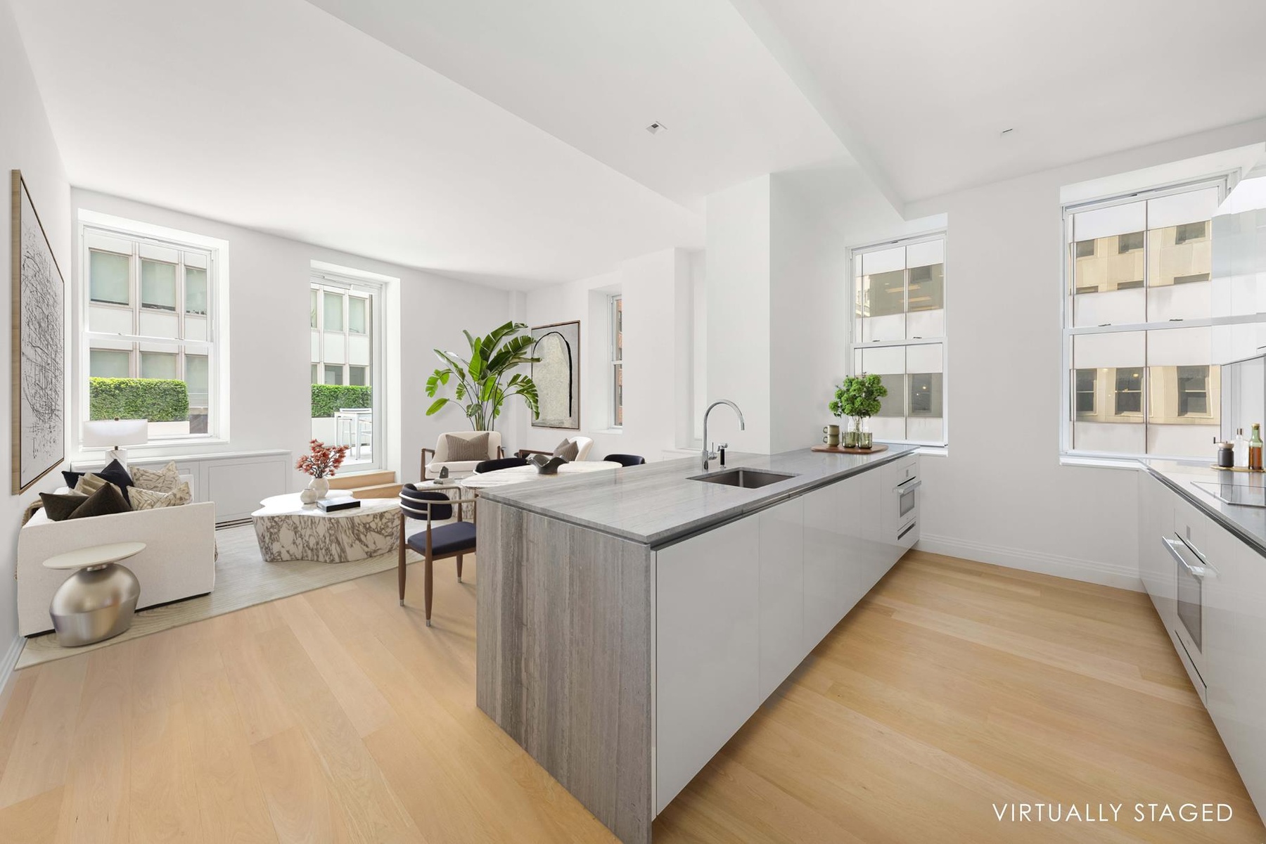 Private Terrace Residence. Move In Ready! Residence 812 is a unique, one-of-a-kind layout within One Wall Street. 812 is an oversized two bedroom, two bath home with a sprawling private terrace. Located in the South/East corner of the building, this home offers natural light, and ample closet space. Custom kitchens and baths pair seamless technology with classic elegance. The Kitchen features Oceanwood marble slabs which rests on custom Aran Cucine cabinetry, accented by white glass panels and satin nickel finishes and is the perfect blend of beauty and function.