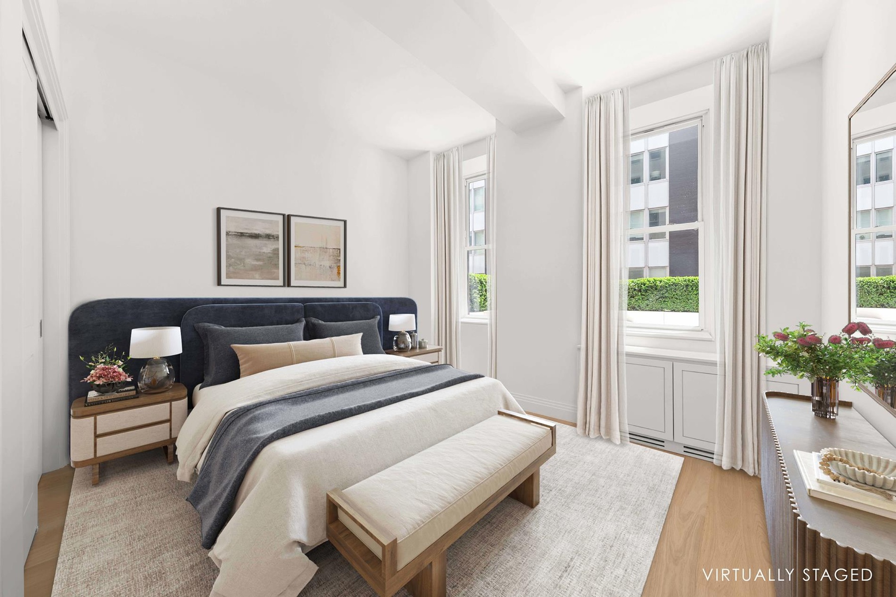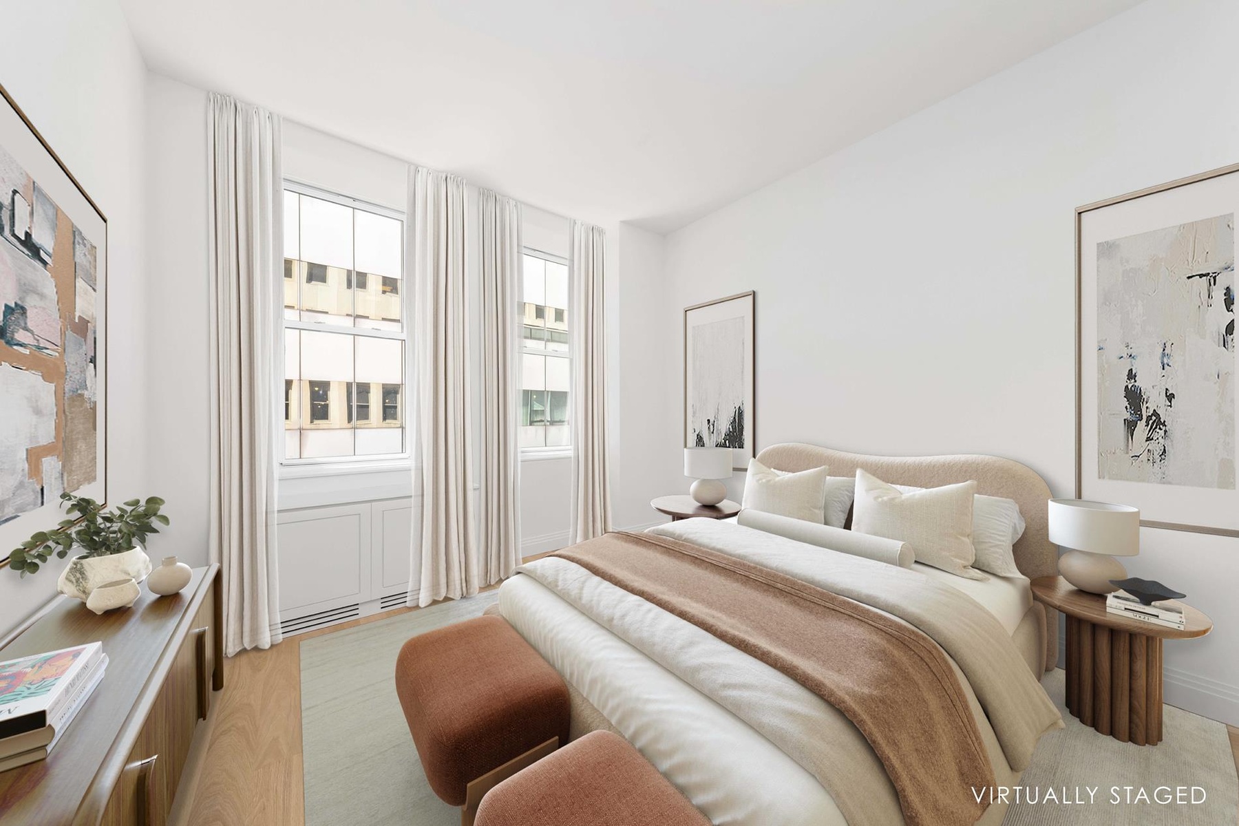 Warm stone primary bathrooms feature large soaking tubs with thermostatic controls. Mirrored medicine cabinets are integrated with LED lighting and Bianco Dolomite marble surround. The building’s one-of-a-kind residences maintain the integrity and character of the 1930s scale, a modern take to art deco detailing, and boast ceiling heights over ten feet throughout with wide-plank French Oak hardwood floors underfoot.