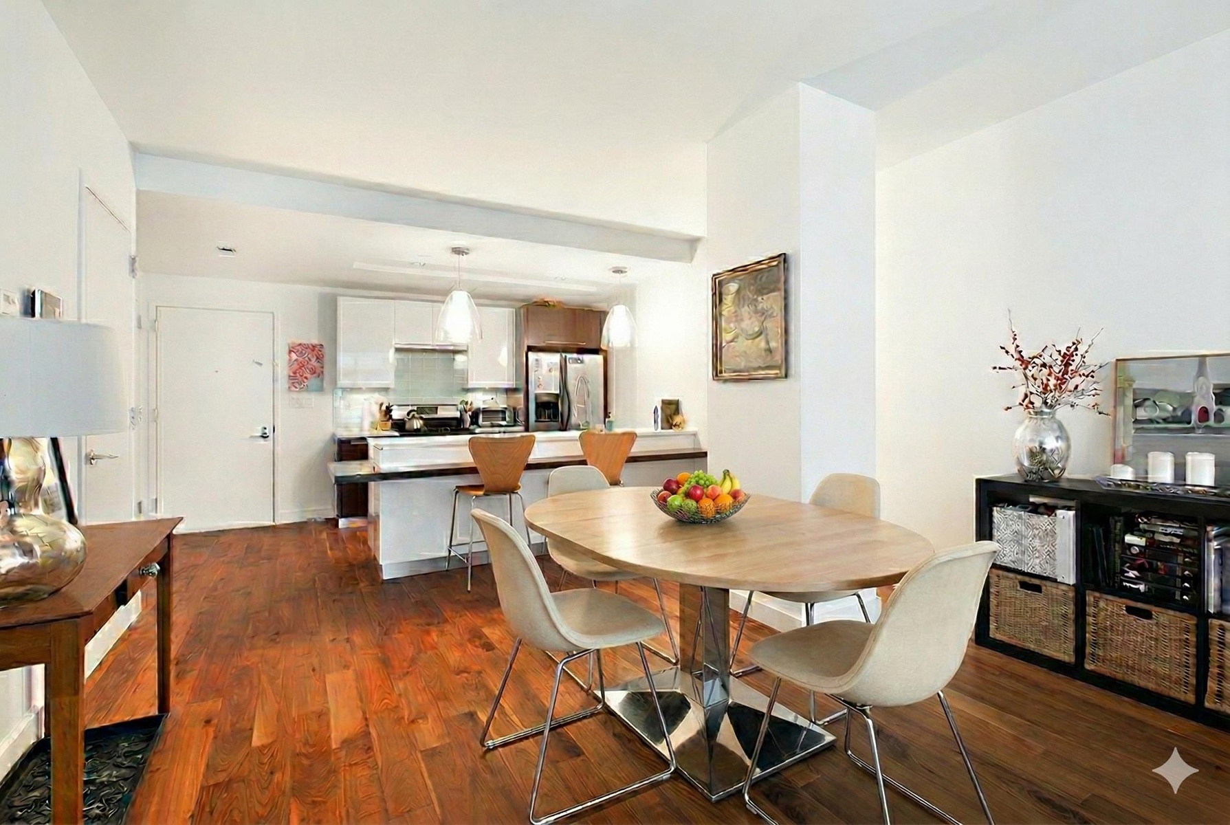 The expansive living area offers a seamless open layout with distinct spaces for lounging and dining, all enhanced by rich American walnut hardwood floors. The open-concept kitchen is both stylish and functional, featuring white lacquer cabinetry, a sleek glass backsplash, quartzite countertops, and a Wengewood breakfast bar—perfect for casual dining or entertaining guests.