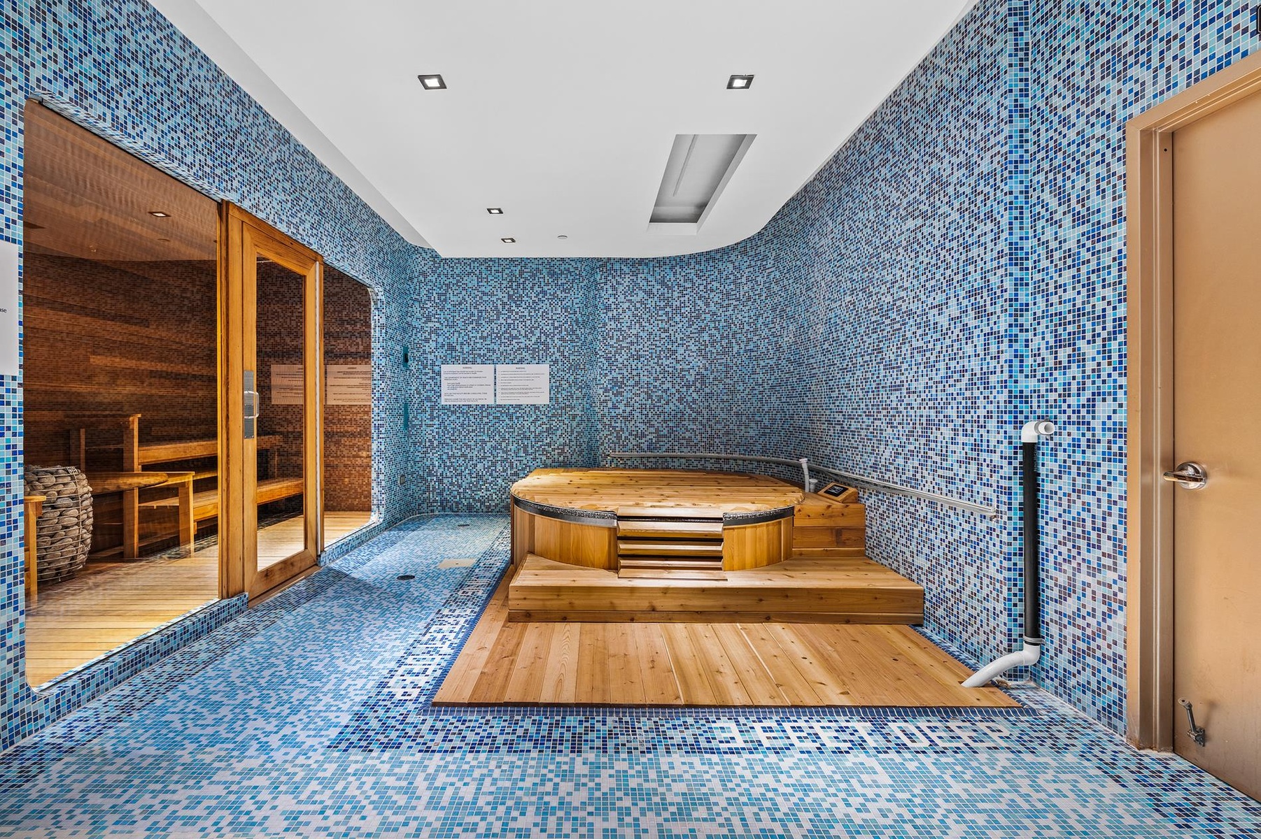 Aqua Grotto, a full-service spa featuring a social whirlpool & sauna, steam room, shower, bathroom, and lockers.