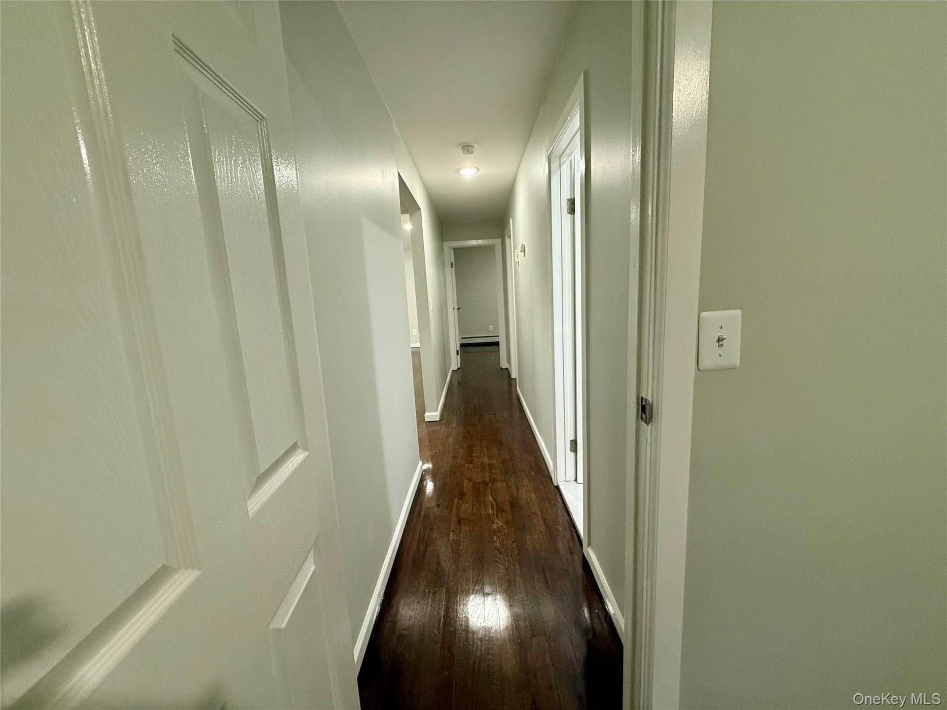 - Unfurnished bedroom with dark wood-style floors and a baseboard heating unit