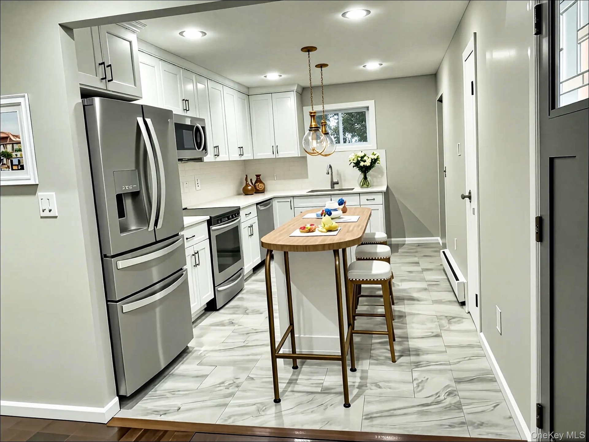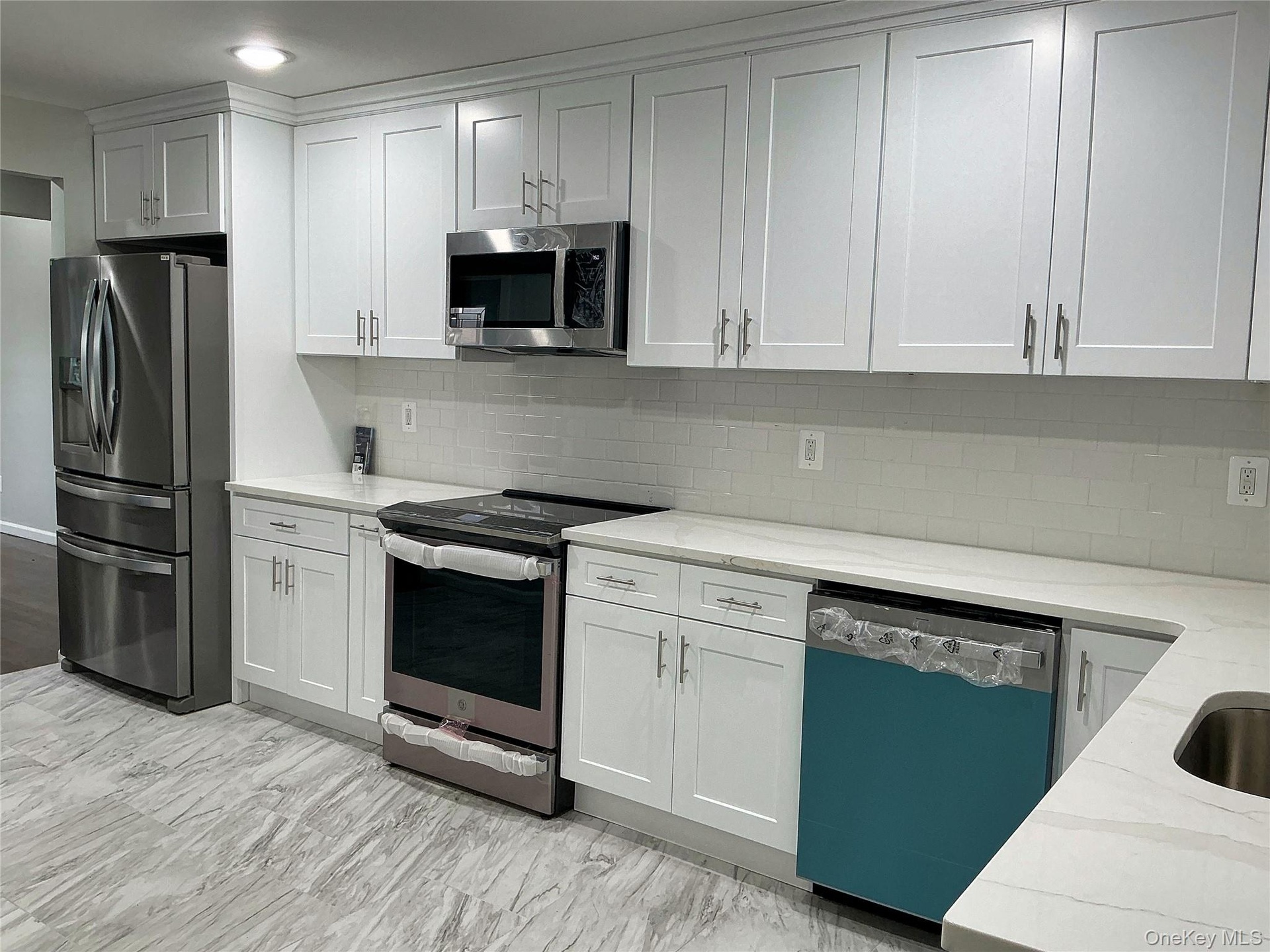- Kitchen featuring appliances with stainless steel finishes, decorative backsplash, white cabinets, light marble finish floors, and baseboard heating