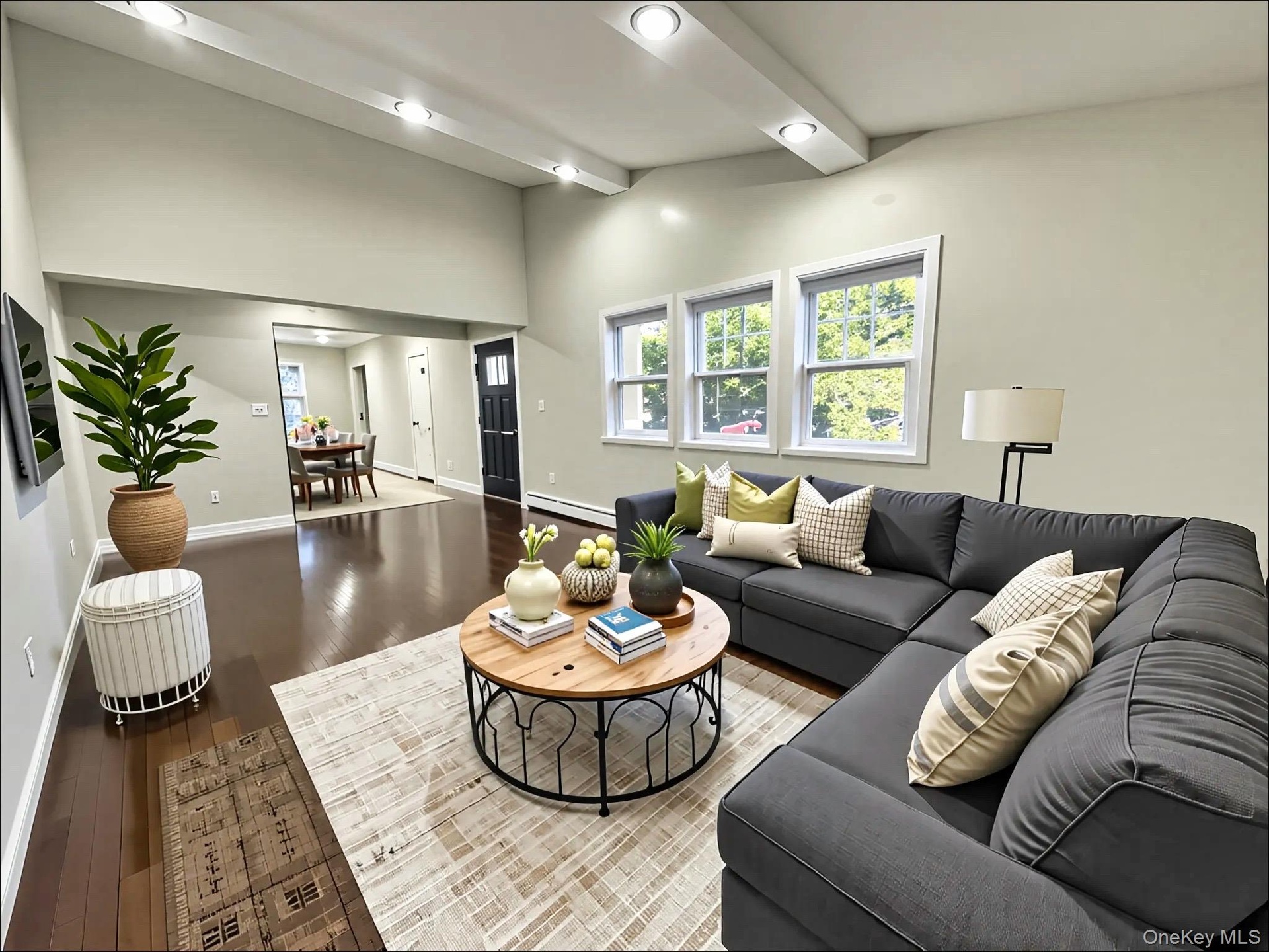 - Living area with dark wood-style flooring, beamed ceiling, and a baseboard radiator