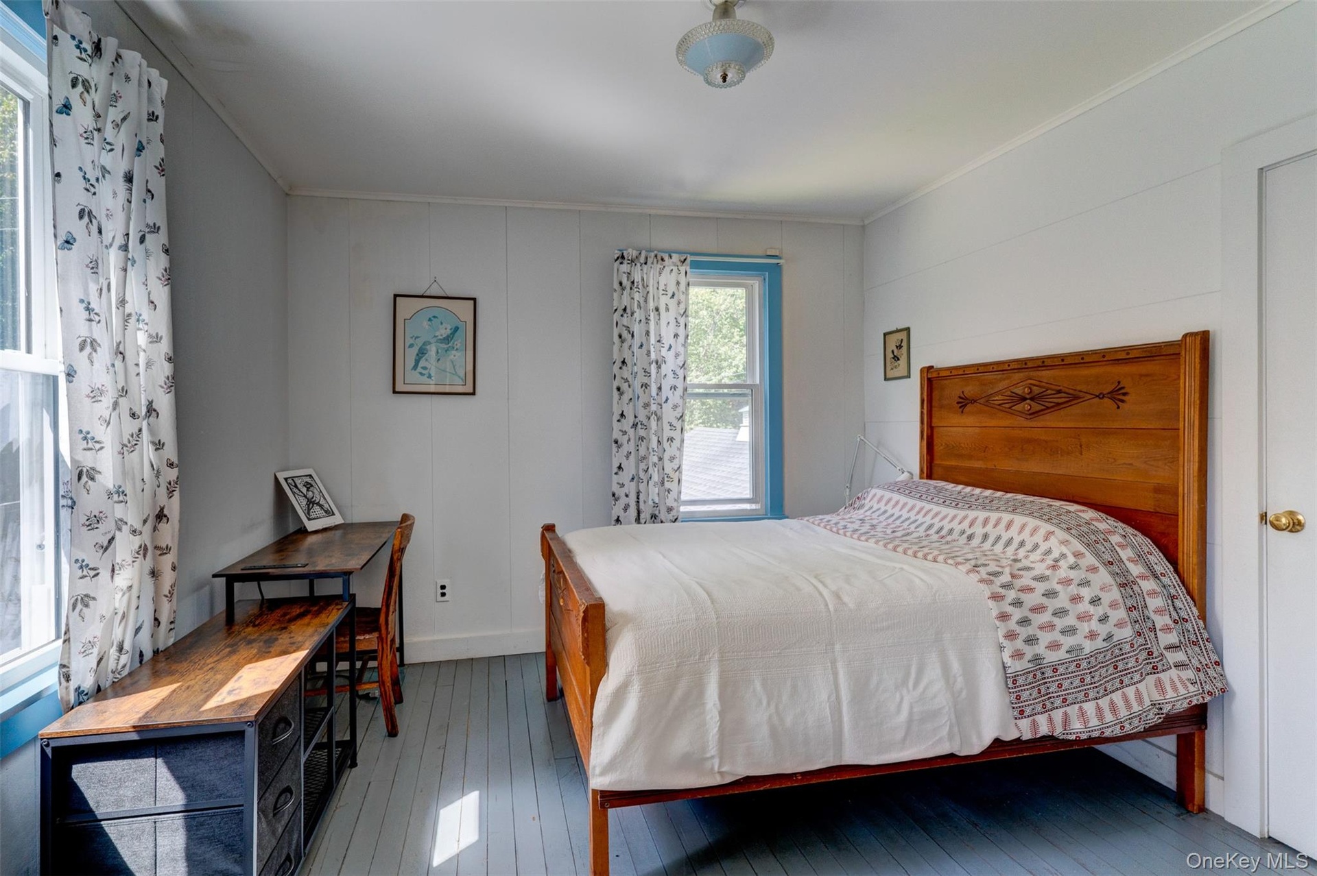 - Bedroom with multiple windows and a decorative wall