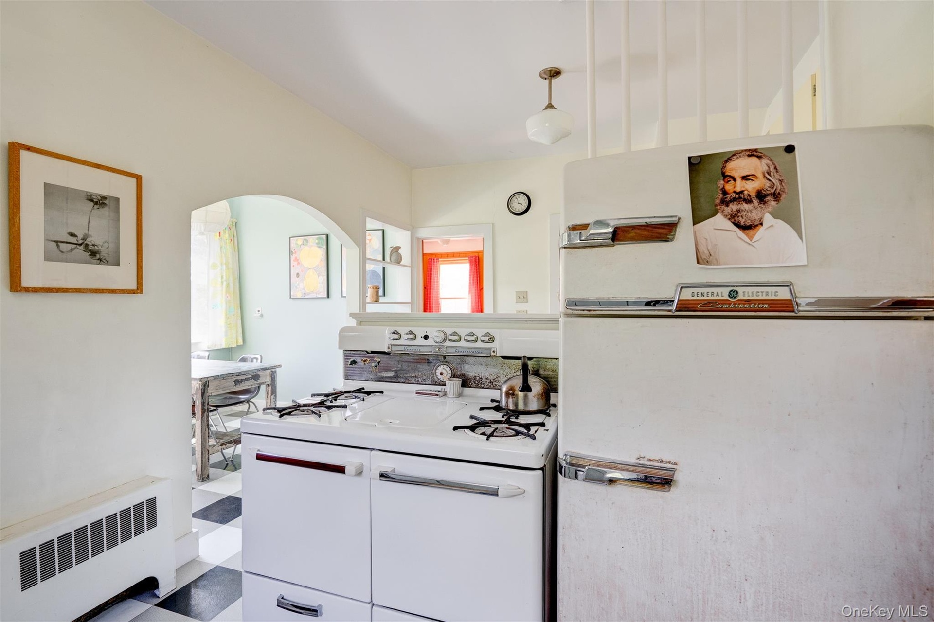 - Kitchen with white appliances, radiator heating unit, arched walkways, light countertops, and white cabinets