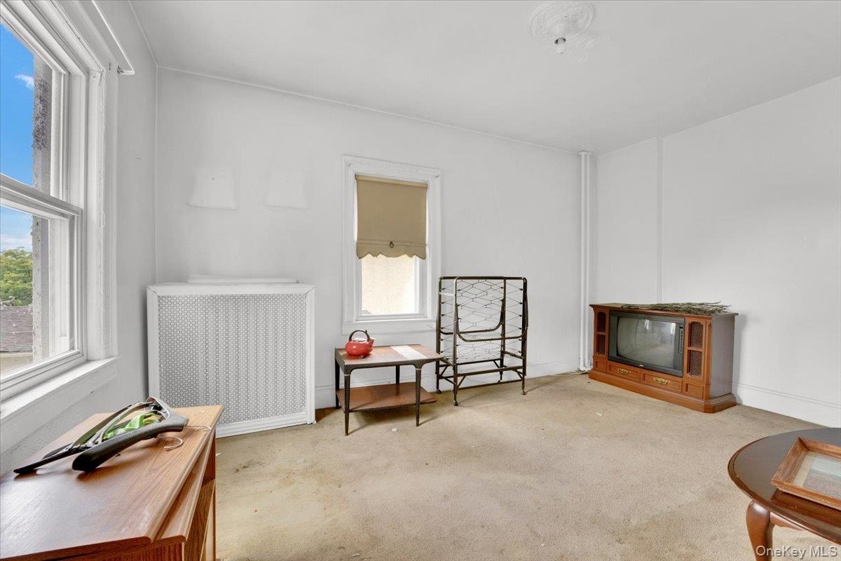 - Living area featuring a textured ceiling, carpet flooring, and radiator heating unit