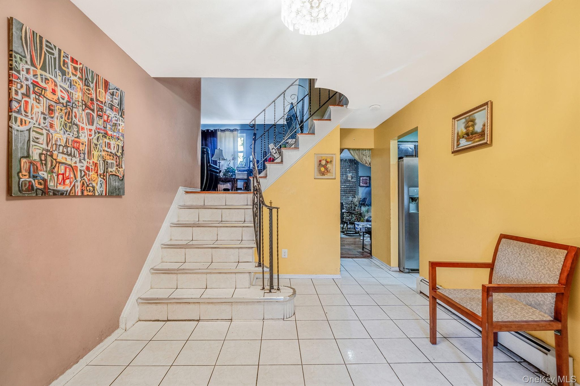 - Stairway featuring baseboard heating, tile patterned floors, and a chandelier