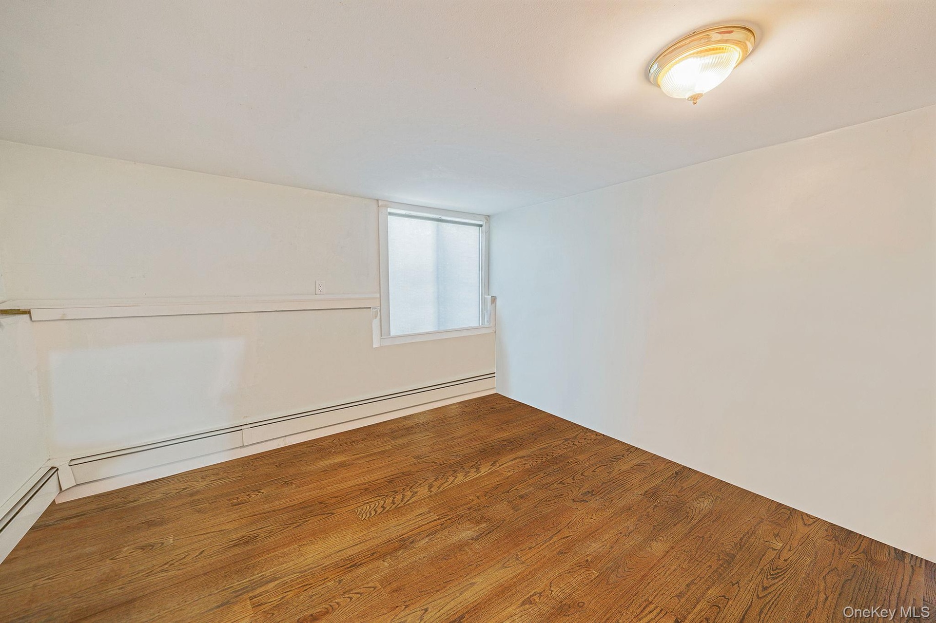 - Empty room featuring wood finished floors, a baseboard heating unit, and a baseboard radiator