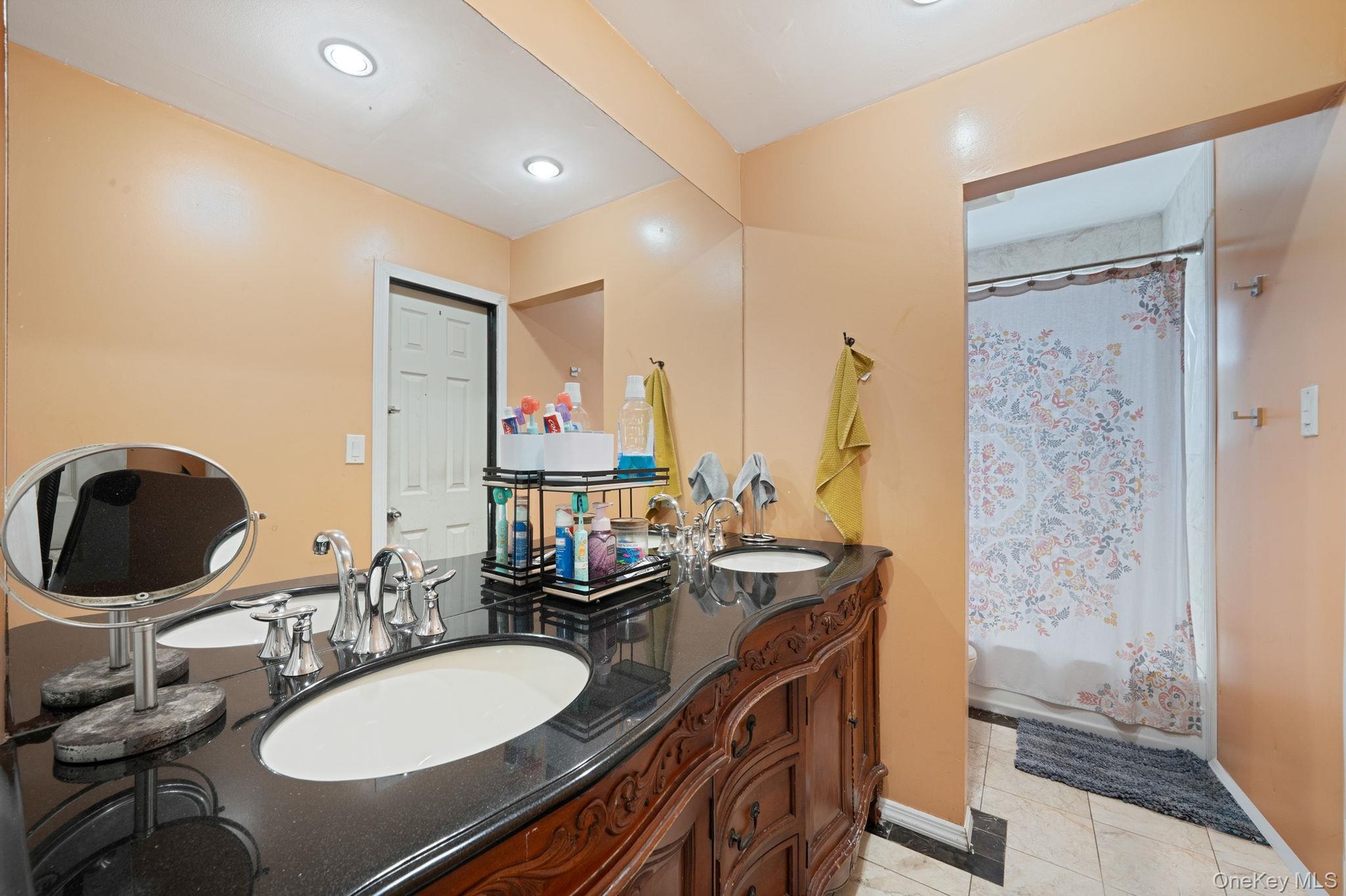- Full bath featuring light tile patterned floors, double vanity, shower / bath combination with curtain, and recessed lighting