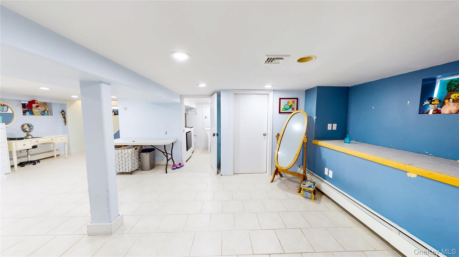 - Empty room with light wood-type flooring, baseboard heating, and recessed lighting
